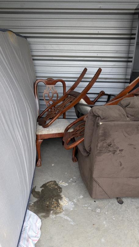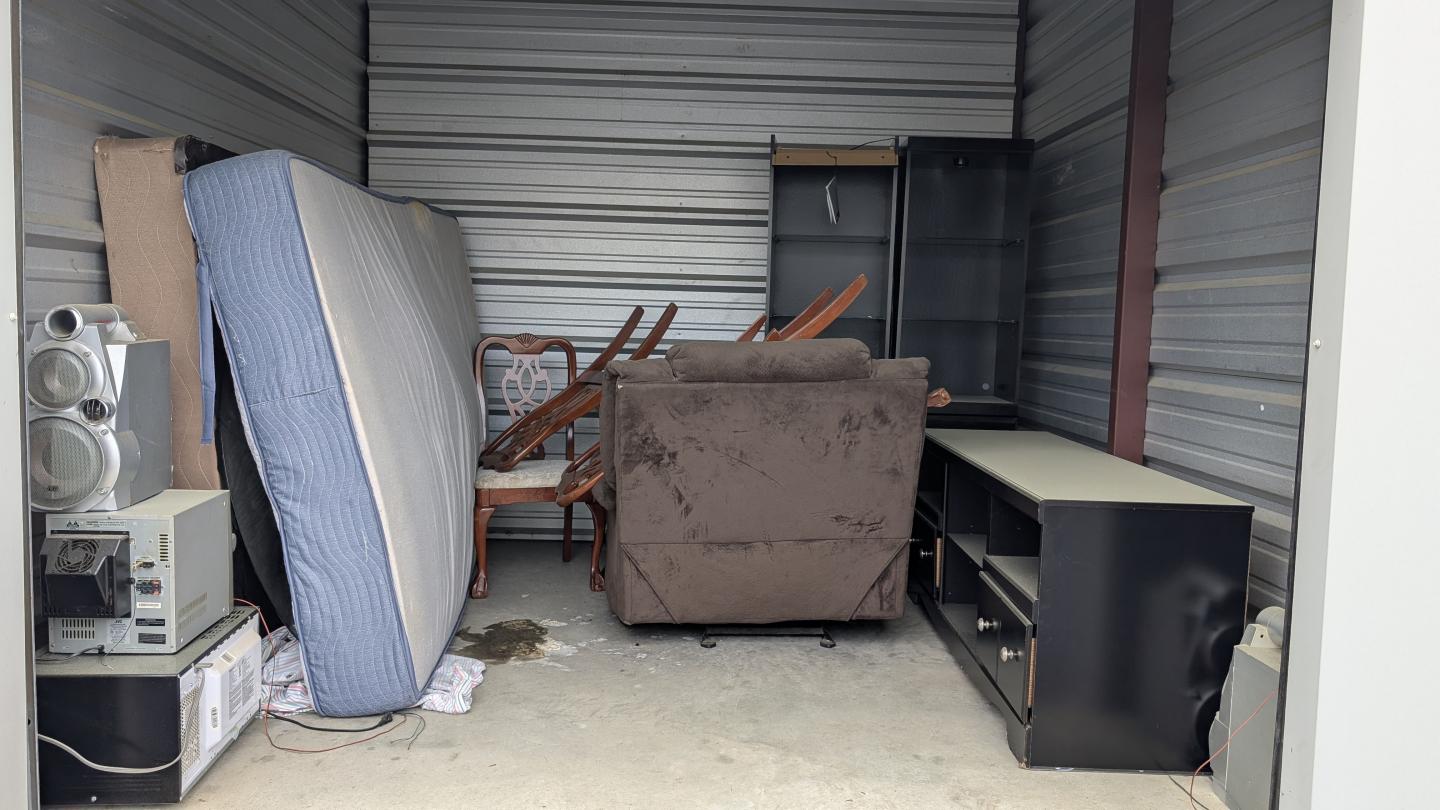This unit appears to contain…CHAIRS, MATTRESS & BOX SPRING, MICROWAVE, STEREO, ENTERTAINMENT CENTER, SHELVES, ETC