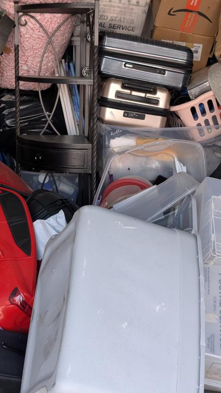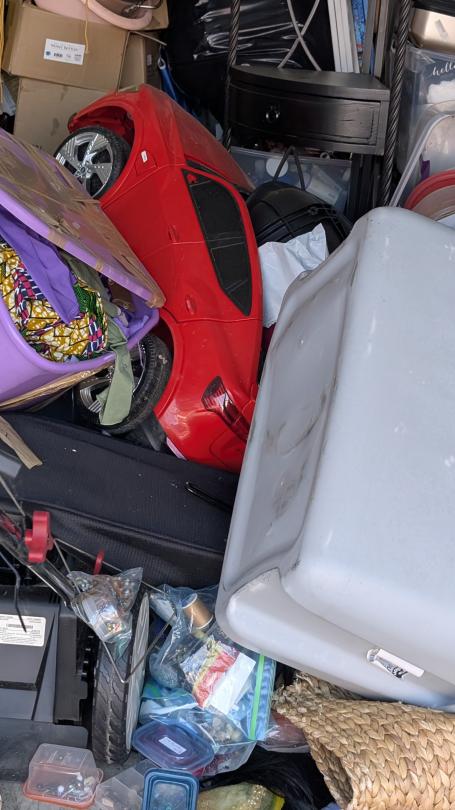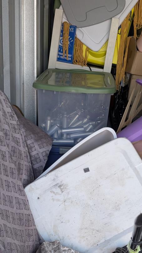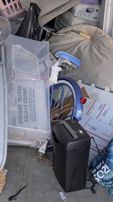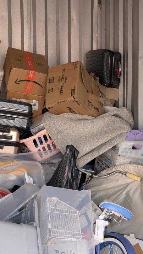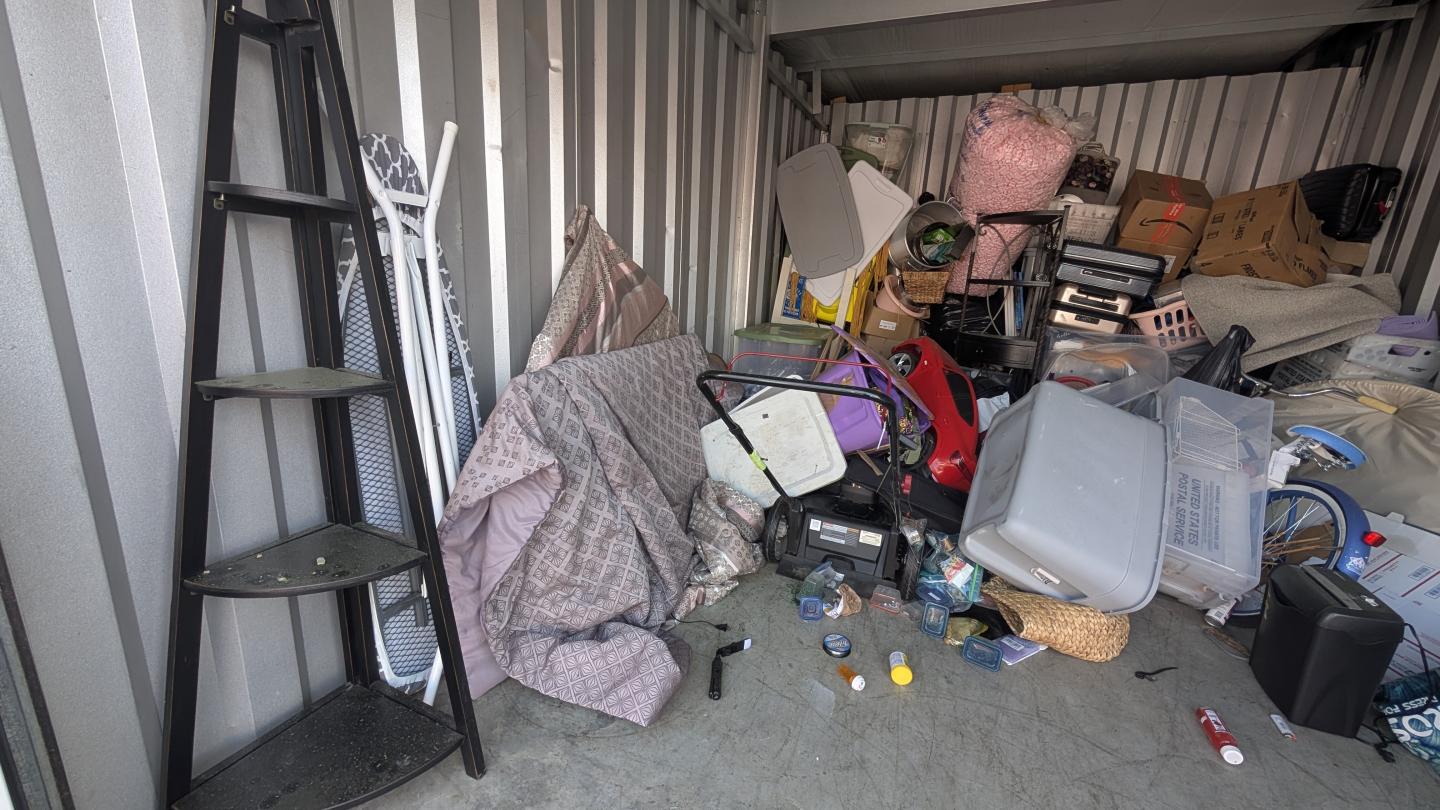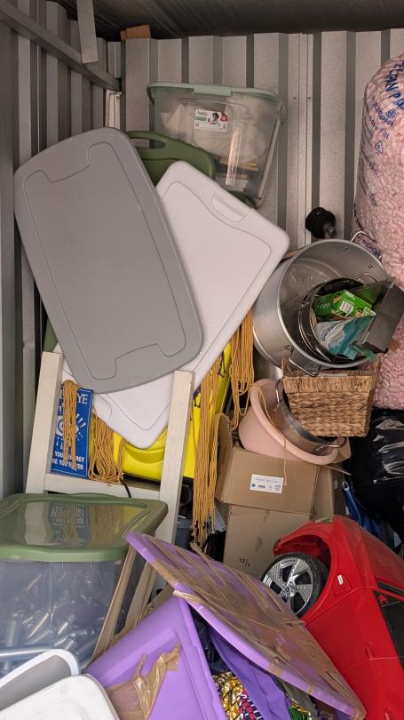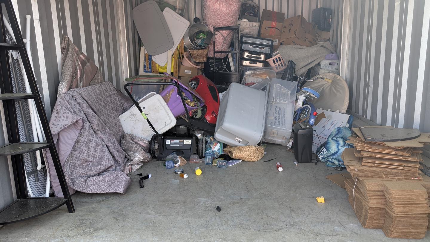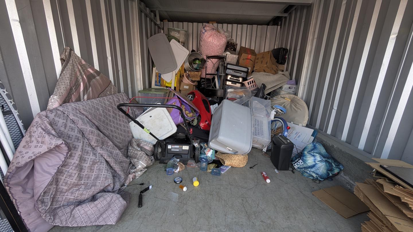 This unit appears to contain…TOTES, LAWN MOWER, BOXES, EMPTY SHIPPING BOXES, SUITCASES, PACKING PEANUTS, CORNER SHELVES, ETC