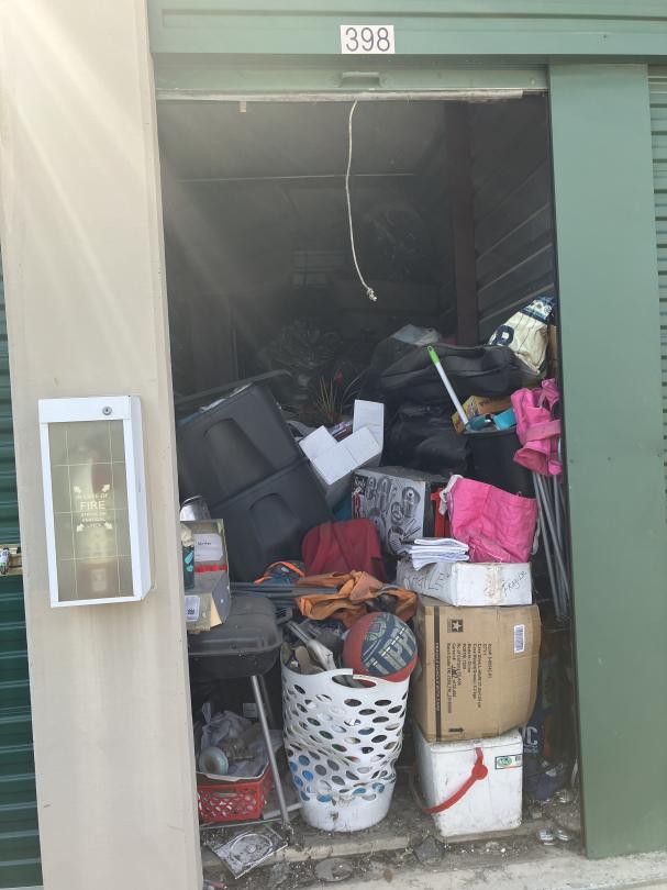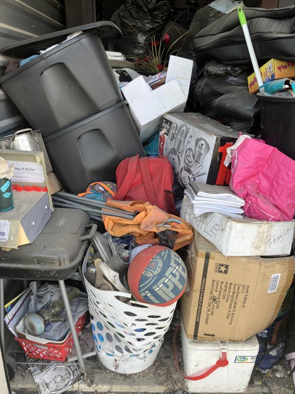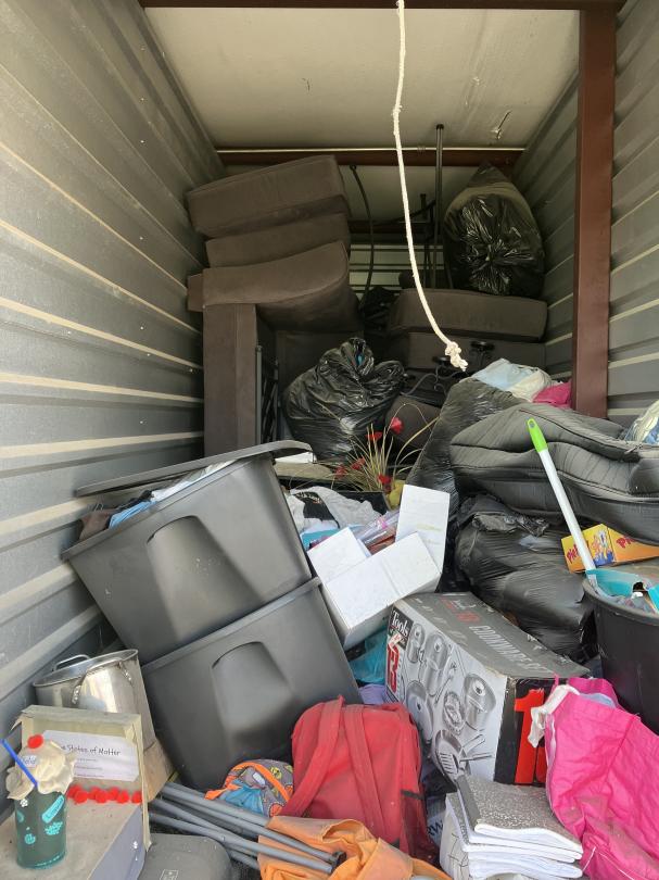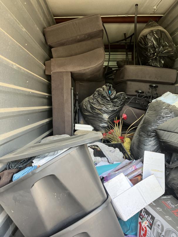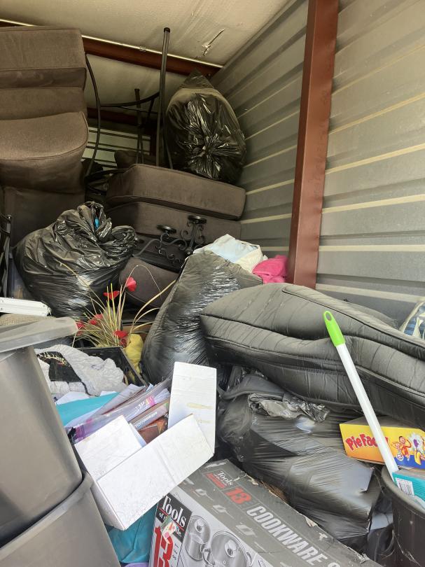 This unit appears to contain…couch,bbq grill,boxes,totes,bags,shoes,chairs,table