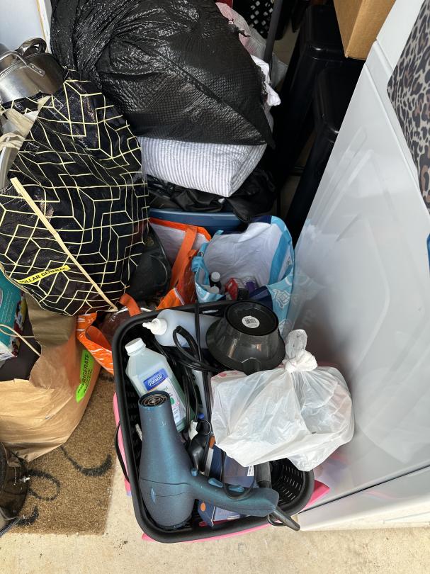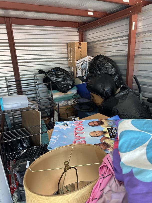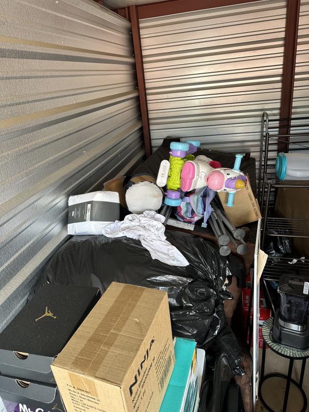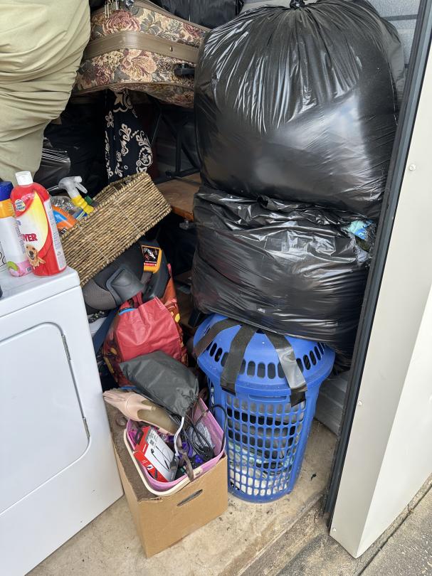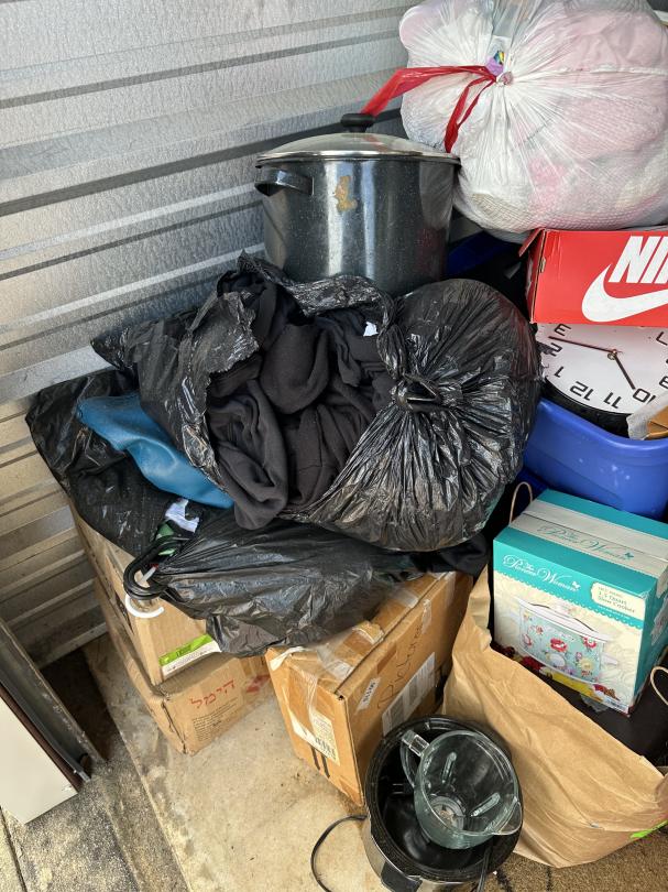 This unit appears to contain…Washer, Shoes, Clothes, Kitchen Ware, Shelves, Folding chairs, furniture, boxes, crock pot, toys, luggage