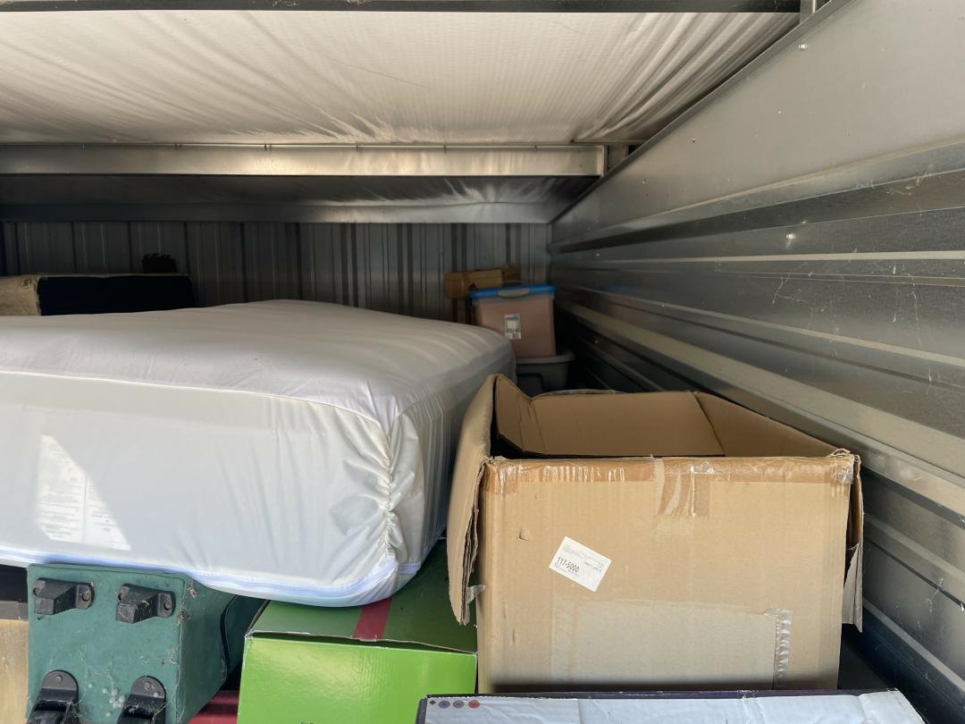 This unit appears to contain…Dresser, Misc Boxes, Misc Bags, Misc Totes, Large Beanbag, Twin Mattress, Bed Frame with Woodend Slats, Floor Lamp, Metal Shelf, Decorations, Foyer Table, Artwork, Tent, Dresser with Hutch.
