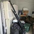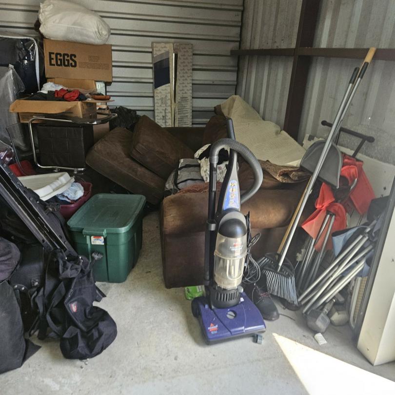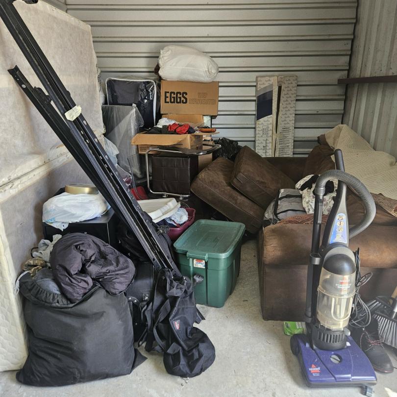 This unit appears to contain…Couches, mattresses, box springs, chairs, plastic bags, plastic containers, misc. boxes, clothing, cleaning supplies, misc. items.
