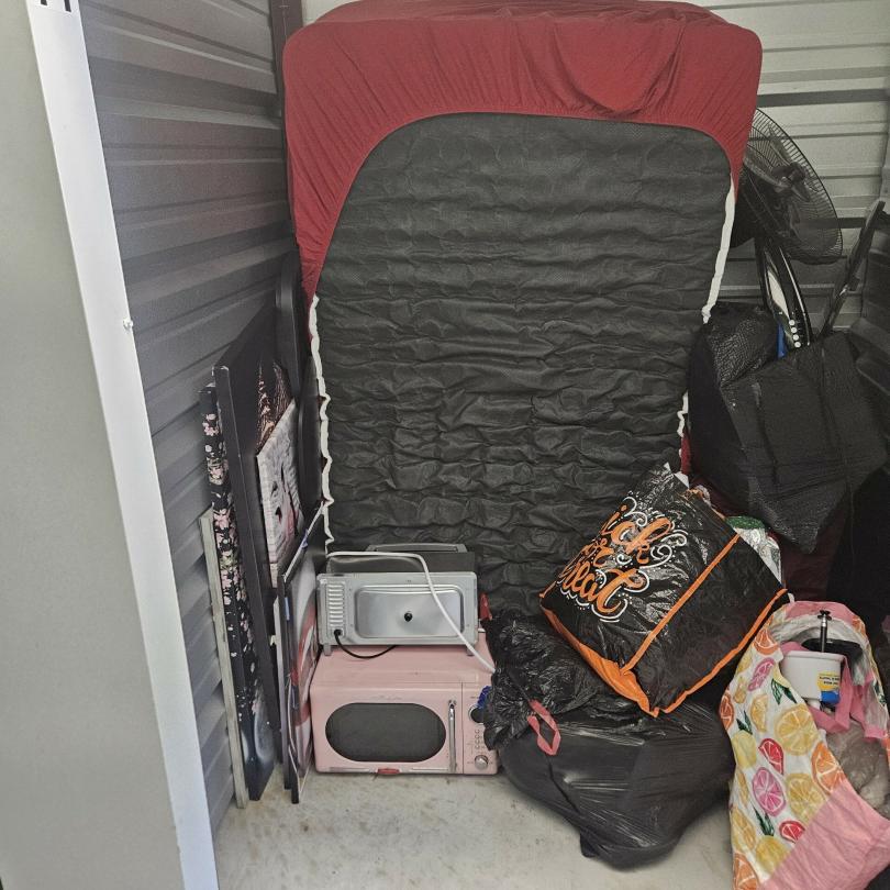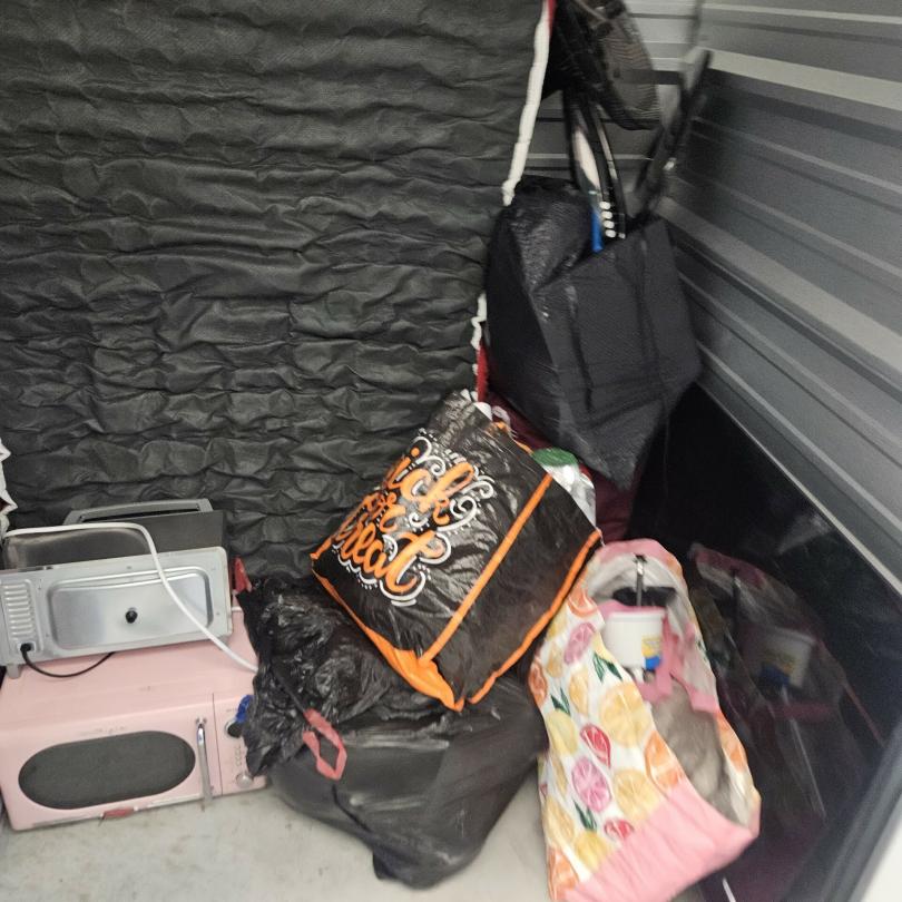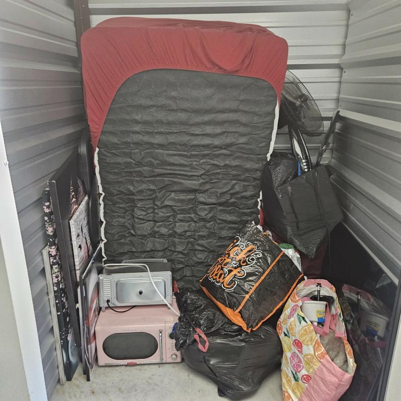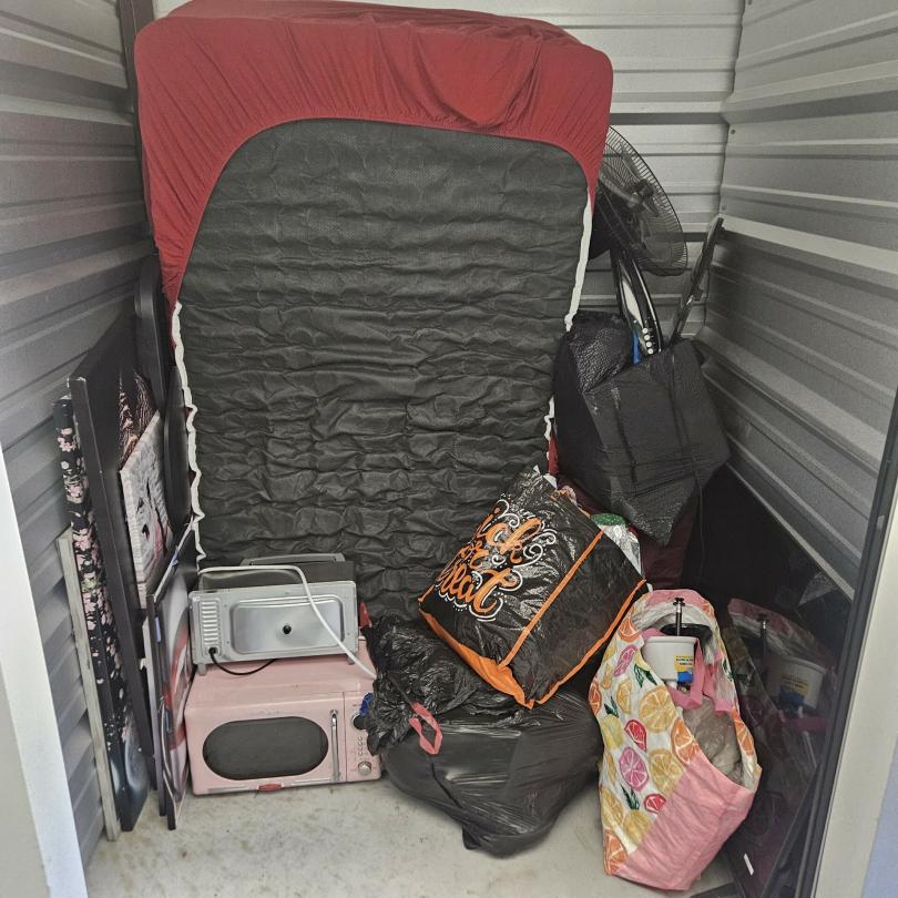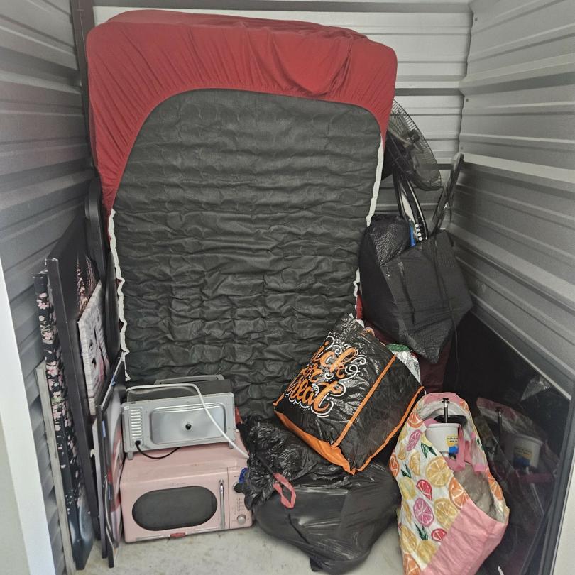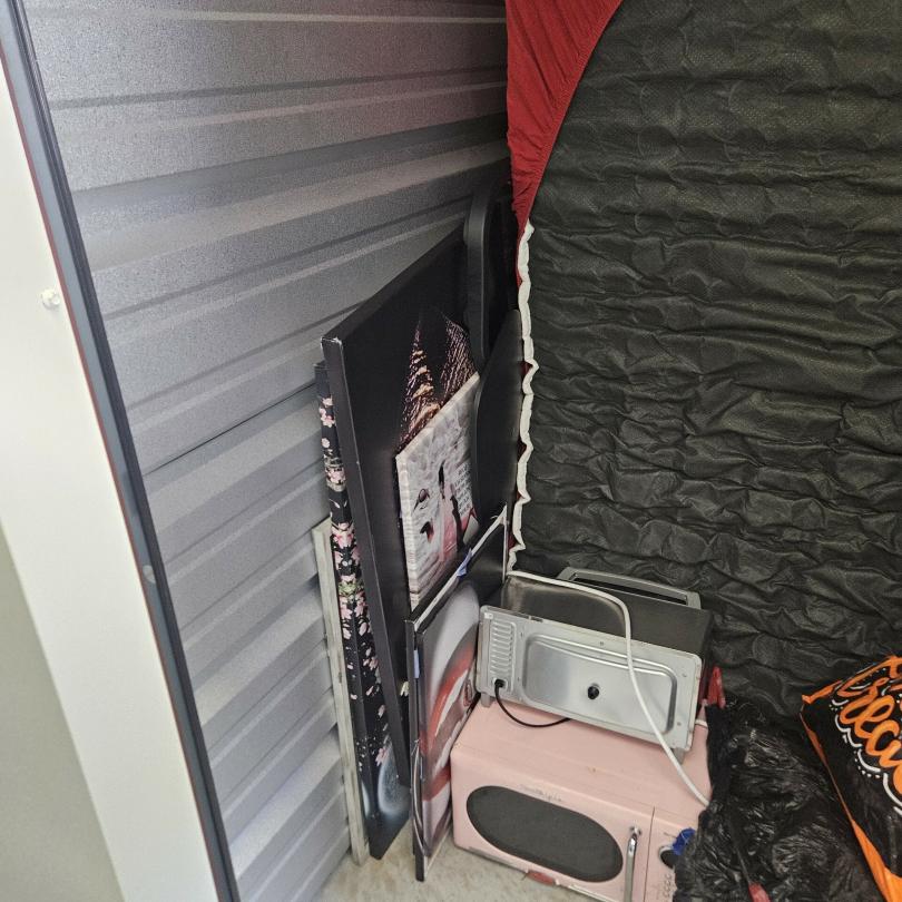 This unit appears to contain…Tv, microwaves, mattresses, plastic bags, artwork, misc. items .