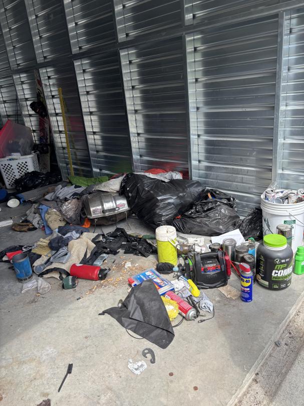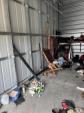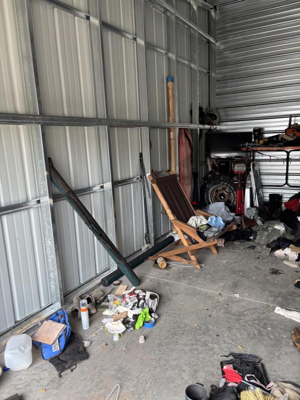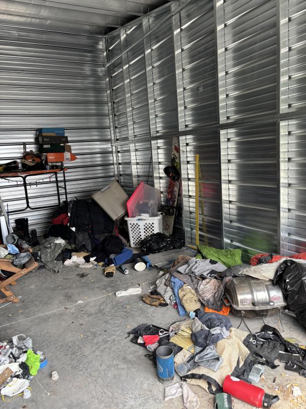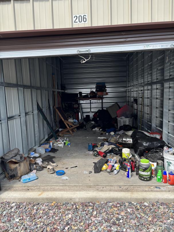 This unit appears to contain…This unit contains a chair, work light, shoes/boots, tabletop grill, tire with rim and misc houshold items and cleaning supplies