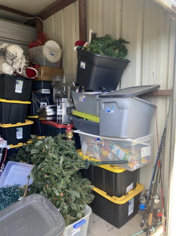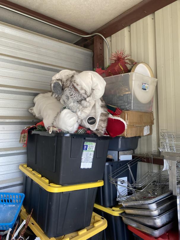 This unit appears to contain…Drive-Up Access, Bins, Christmas Decor, Household Items