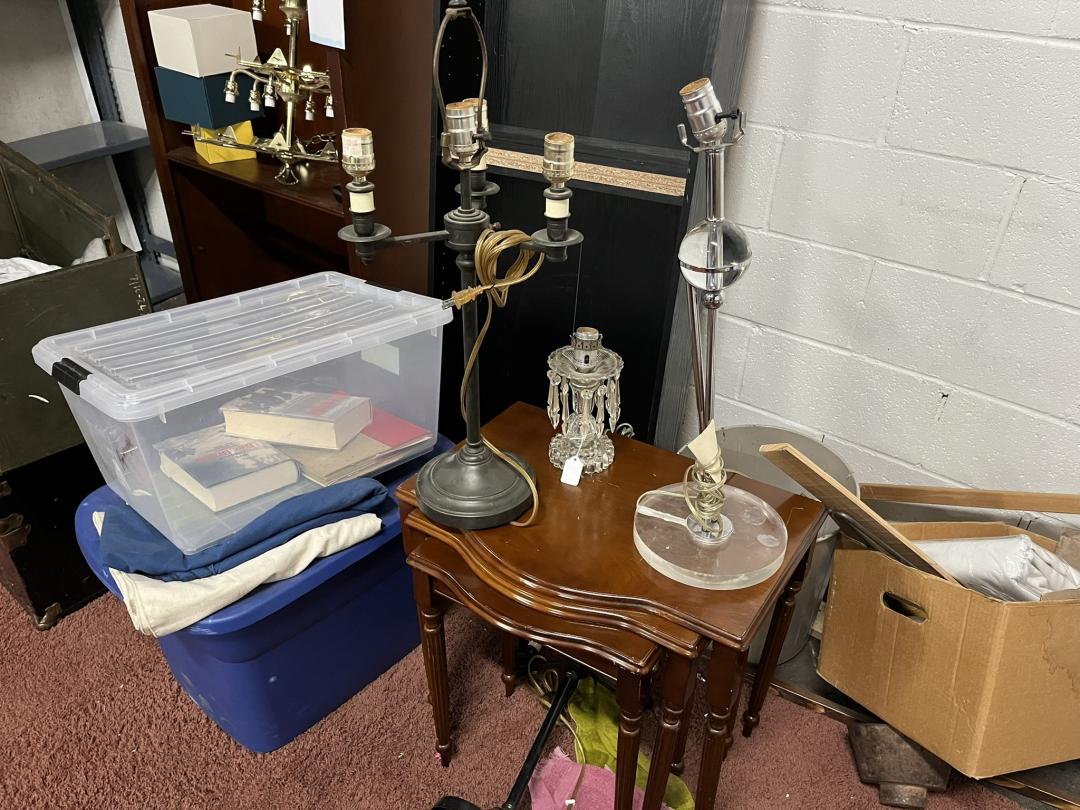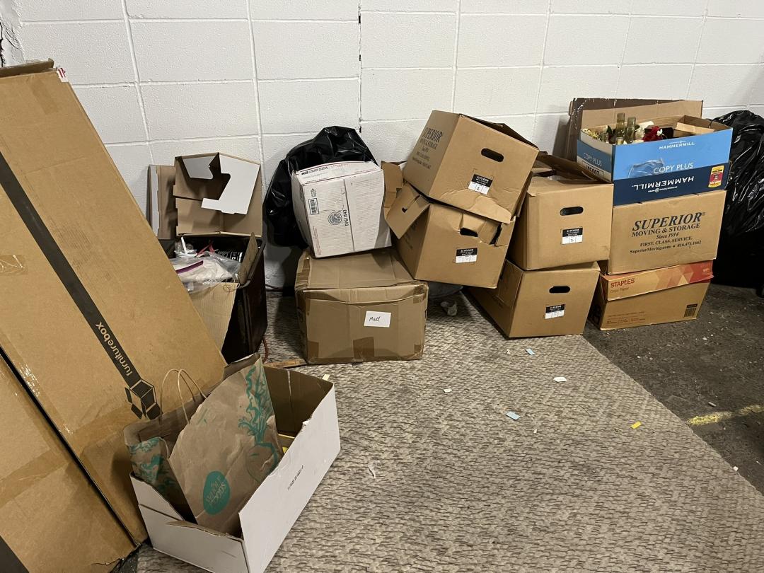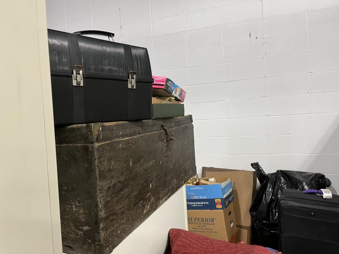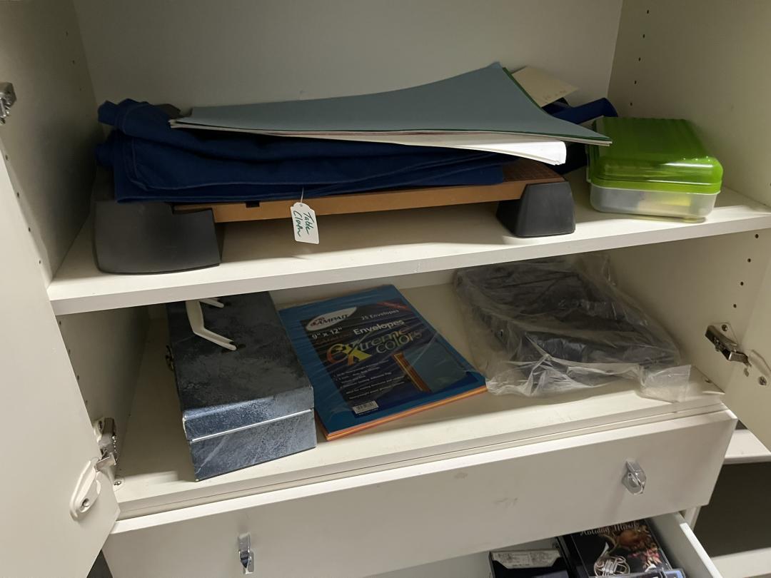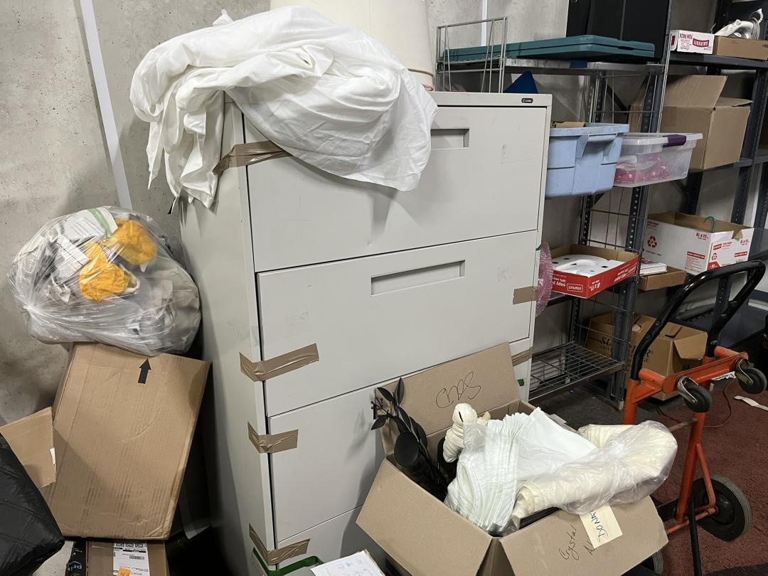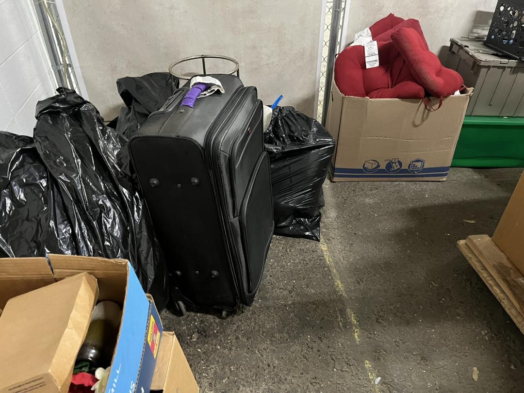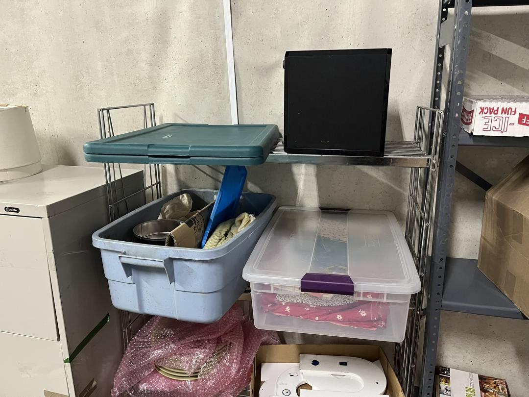 This unit appears to contain…Filing cabinets, shelving. lamps, tables, kitchenware, decor, plastic containers, misc.. boxes, suitcase, bookbag, artwork, throw pillows, seat cushions, plates, misc. items.