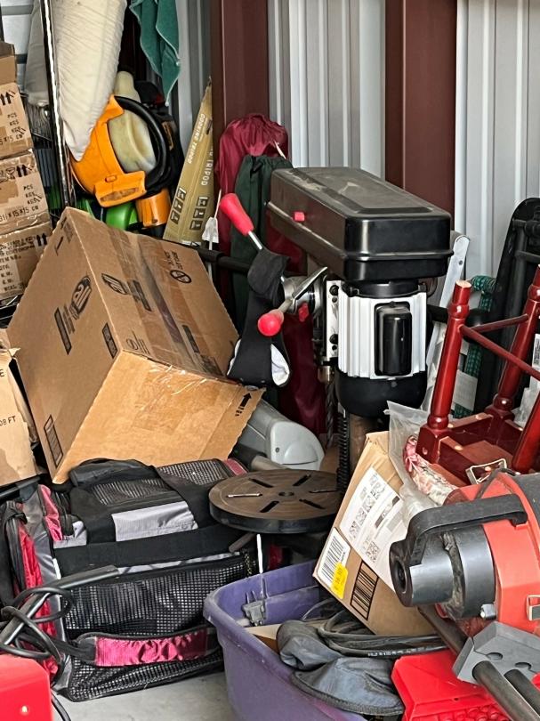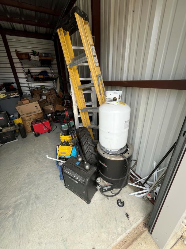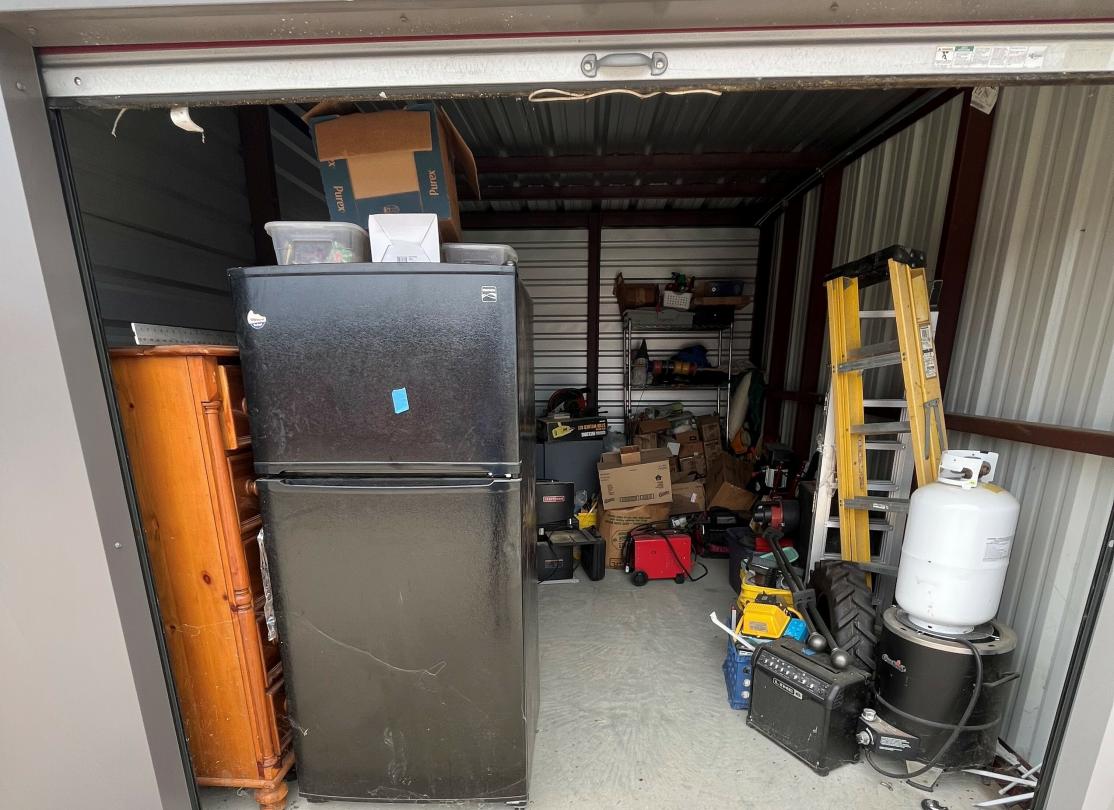 This unit appears to contain…Fridge, power Tools, Ladders, Dresser, Propane Grill, Weed Eater, Welder, Shop Vac