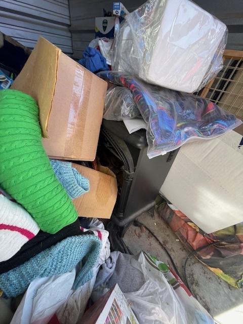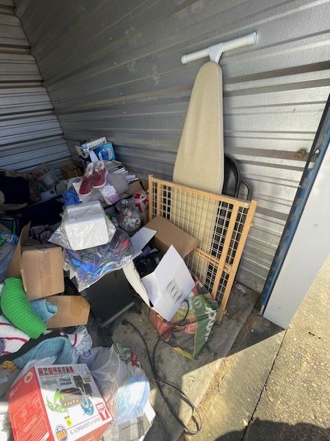 This unit appears to contain…Three pet beds, electric fireplace, Atari box (contents of box unknown), womens clothing, shoes, bags and purses, shoe rack, ice chest, step stool, Vick's humidifier, ironing board, Emerson speaker and misc boxes.