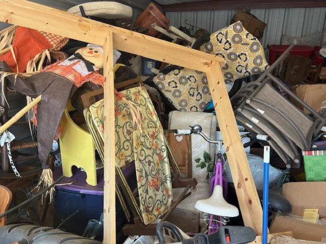 This unit appears to contain…Unit appears to contain various lawn and garden items including a mower. chairs, boxes, shelves, glassware, collectibles.
