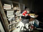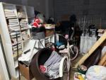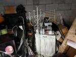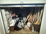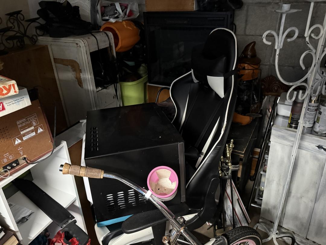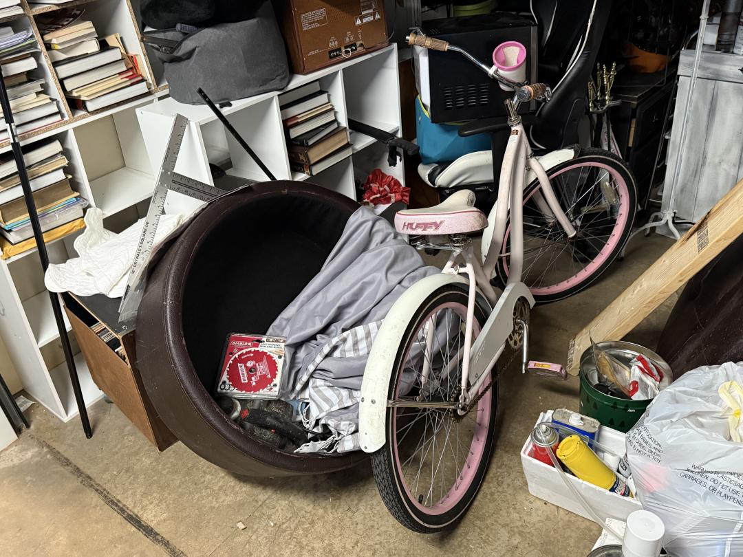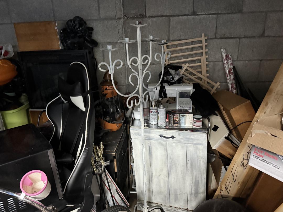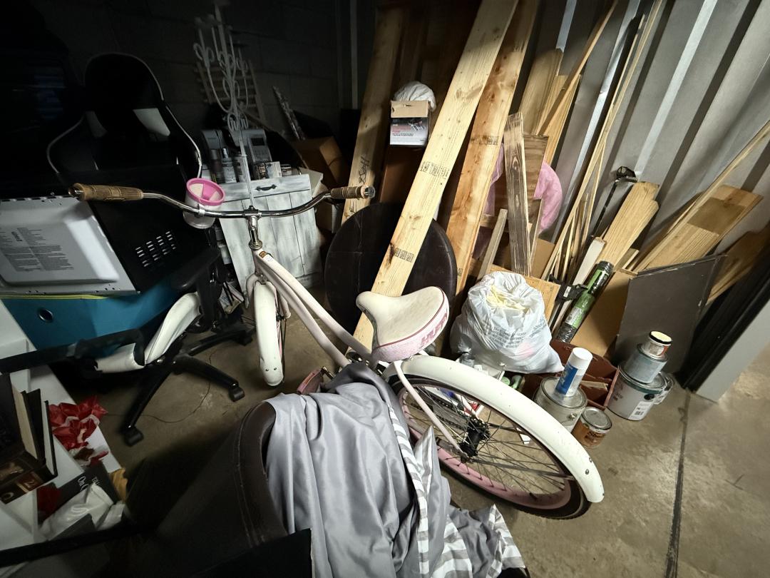 This unit appears to contain…This unit consists of books, board games, a sewing machine, a microwave lumber, paint, a bicycle, and a bookshelf.