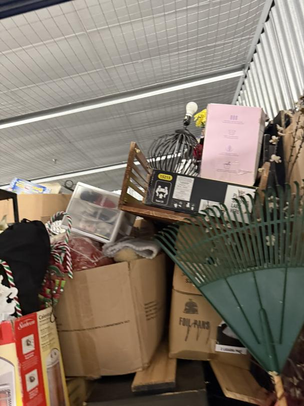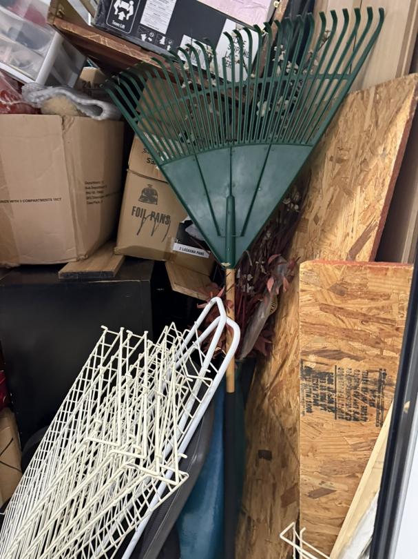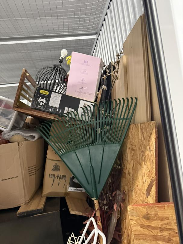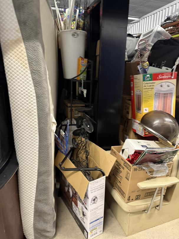 This unit appears to contain…Fish Tank, Chair, Hairdresser chair, Mattress, Bags, Rugs, Dresser, Christmas Decoration, Racks, Fan, Wood, Shelves, Mirror, Boxes, Totes, Rake