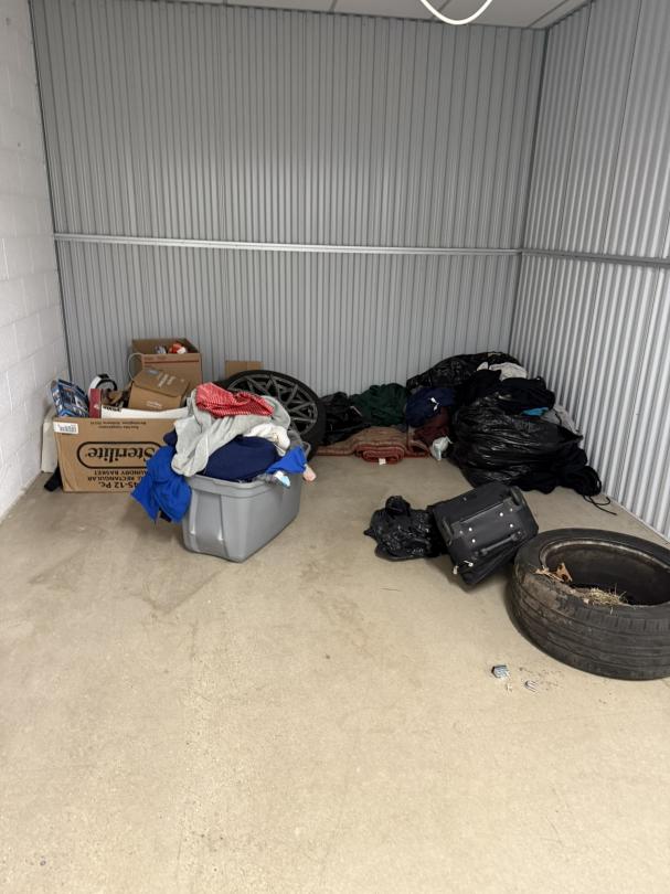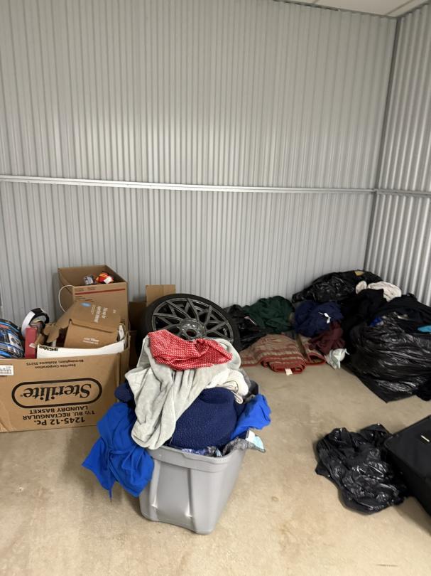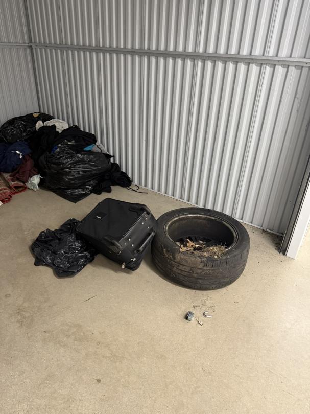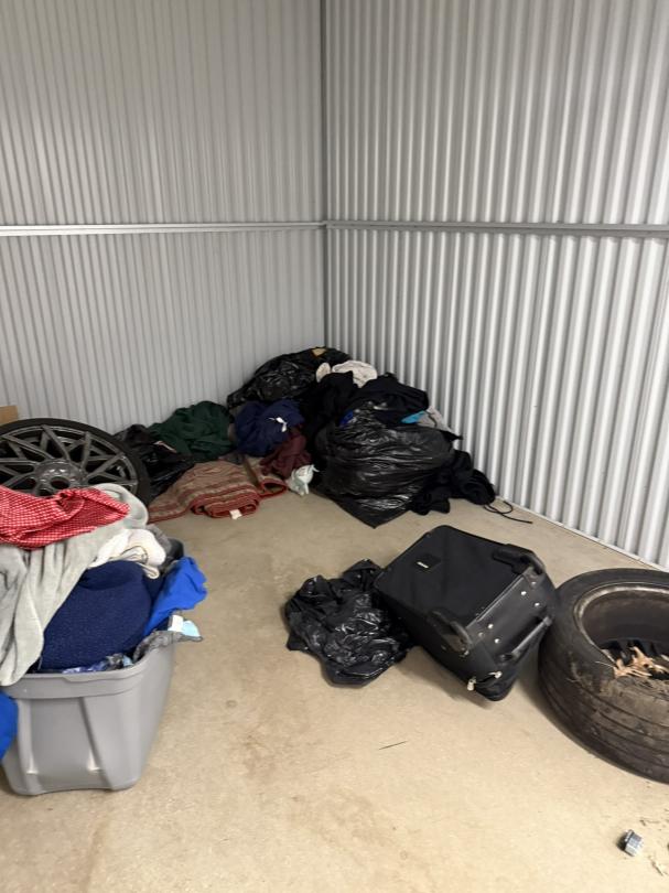 This unit appears to contain…Totes, bags, Clothes, Tires with rims, Rug