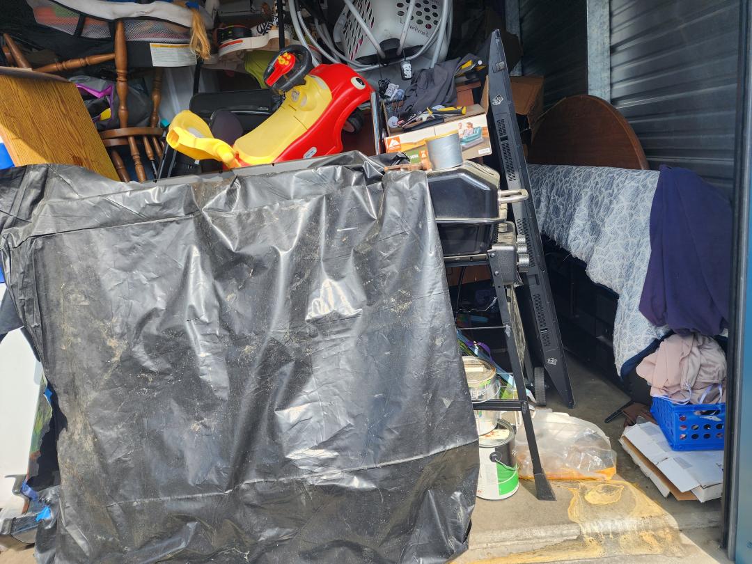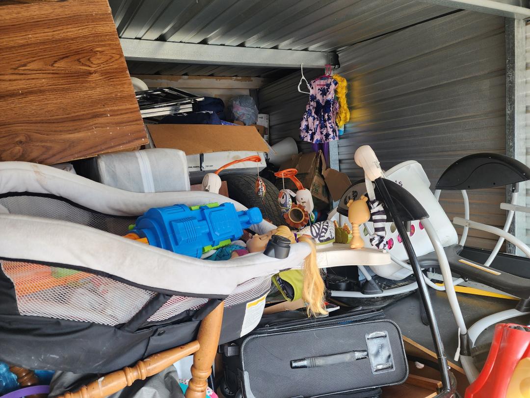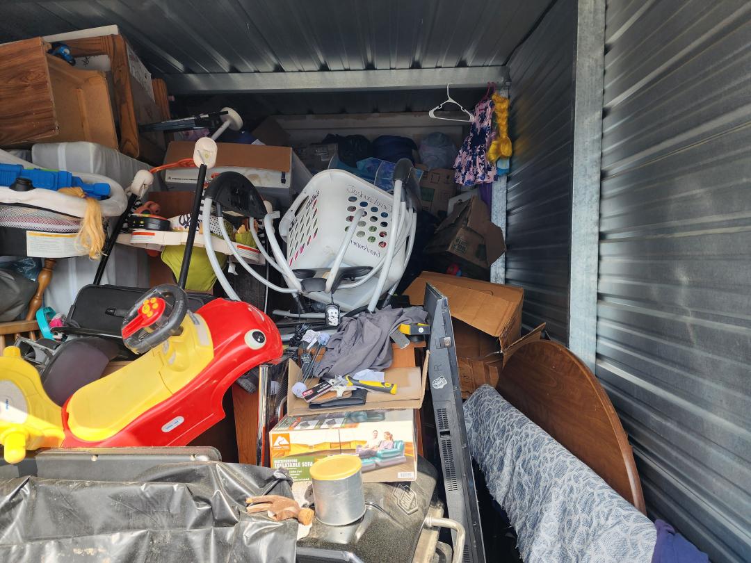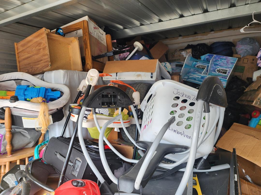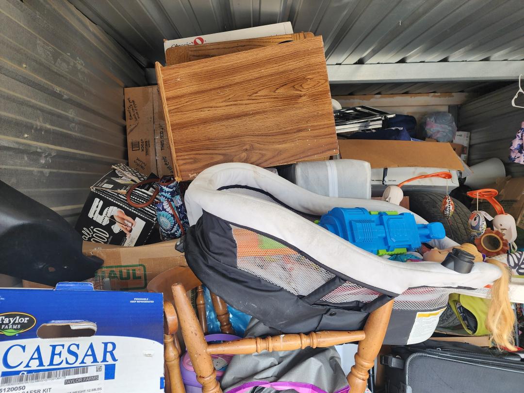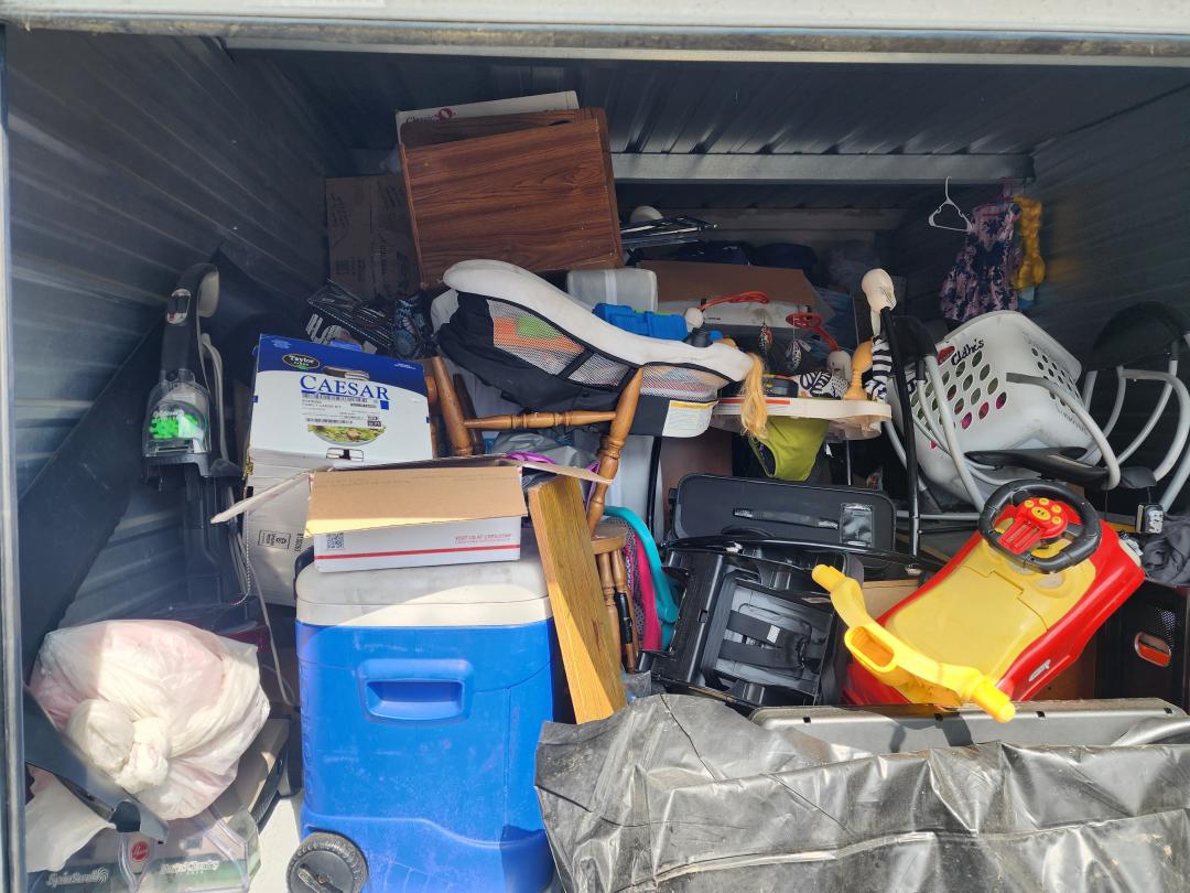 This unit appears to contain…Grill, TVs, tabletop, baby swing, cradle, toys, bouncer, boxes, paint, freezer, furniture, H/H, bags, clothes, tire, shoes, vacuum, chairs, car seat, cooler, suitcase