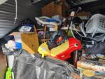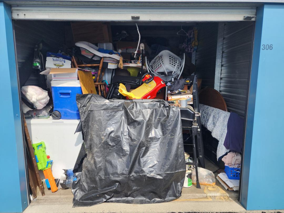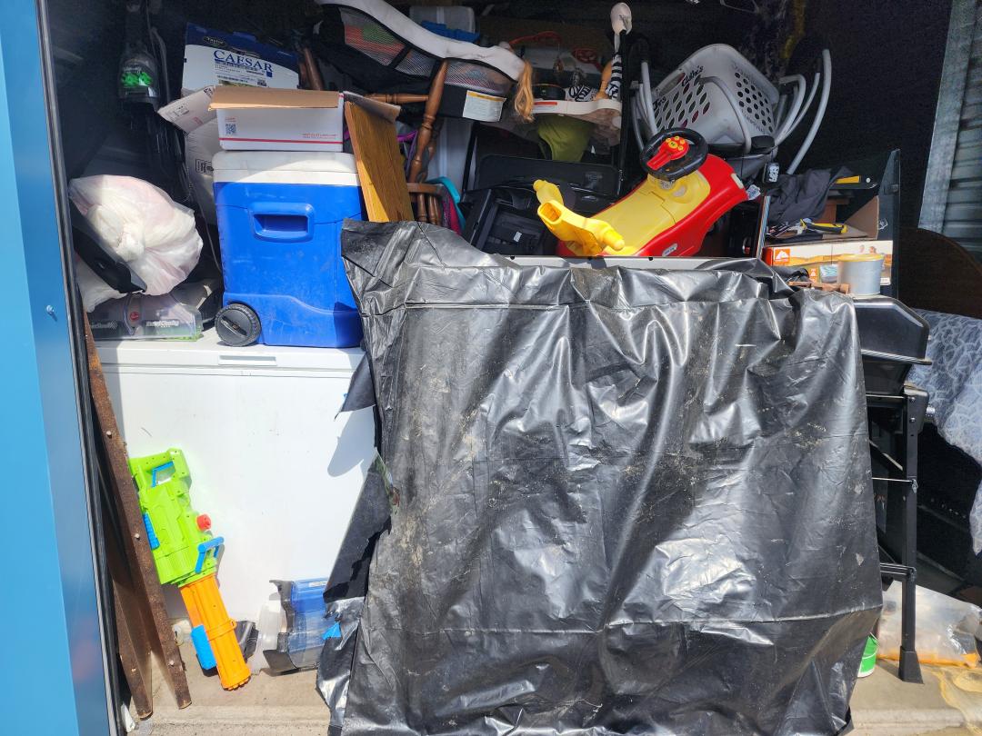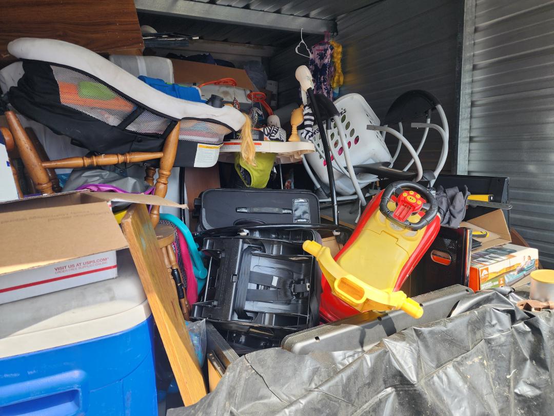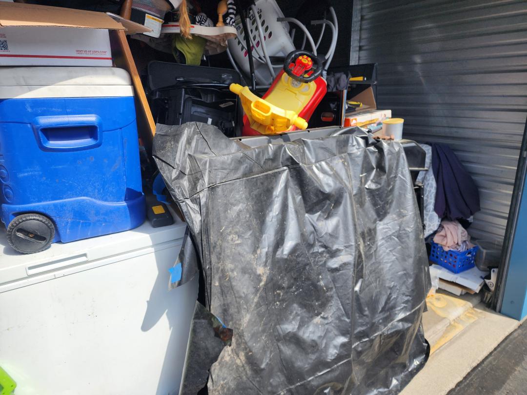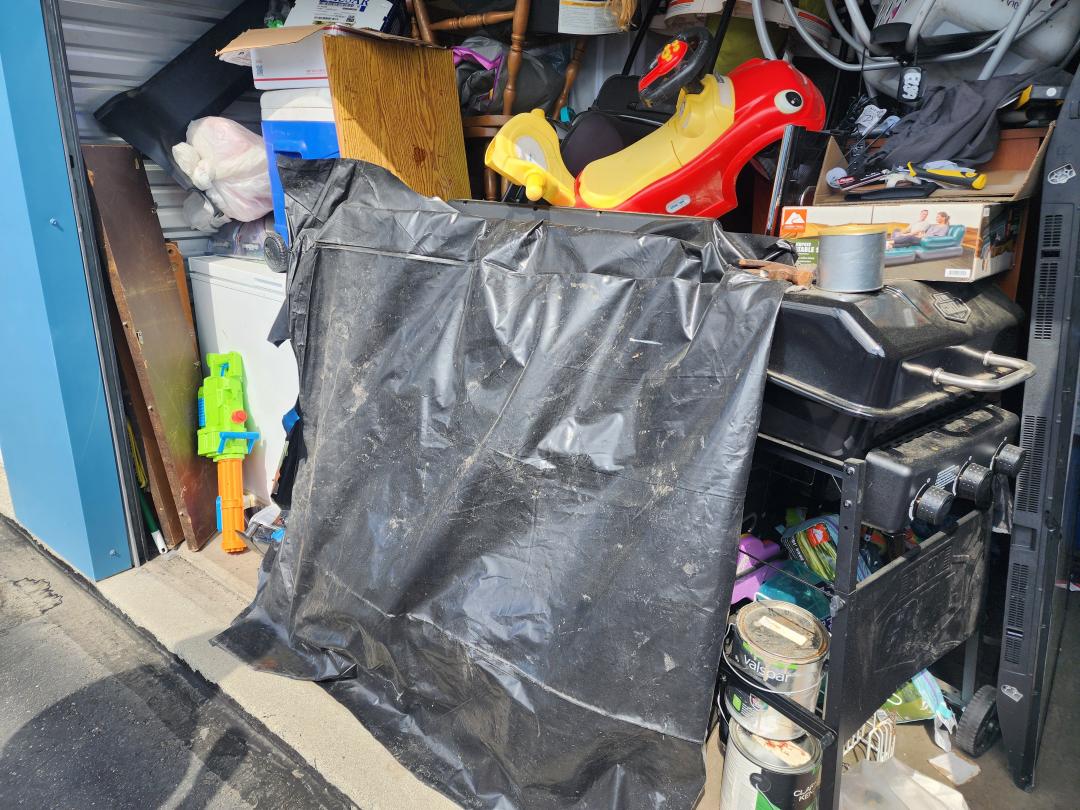 This unit appears to contain…Grill, TVs, tabletop, baby swing, cradle, toys, bouncer, boxes, paint, freezer, furniture, H/H, bags, clothes, tire, shoes, vacuum, chairs, car seat, cooler, suitcase