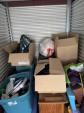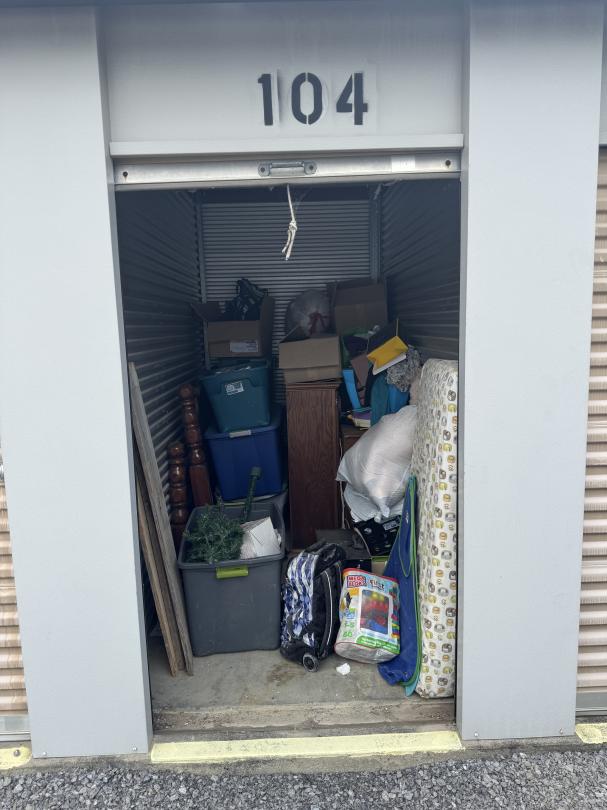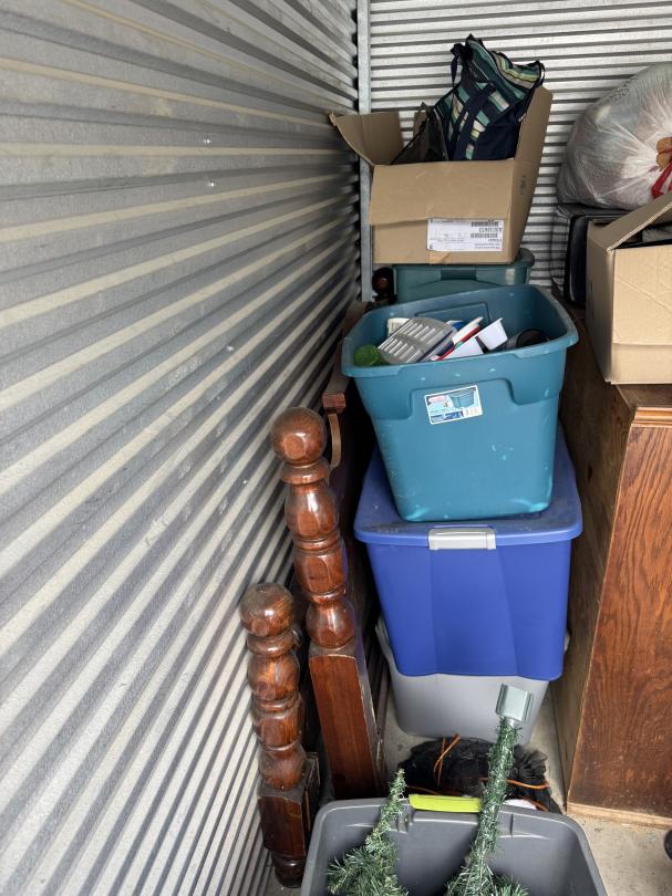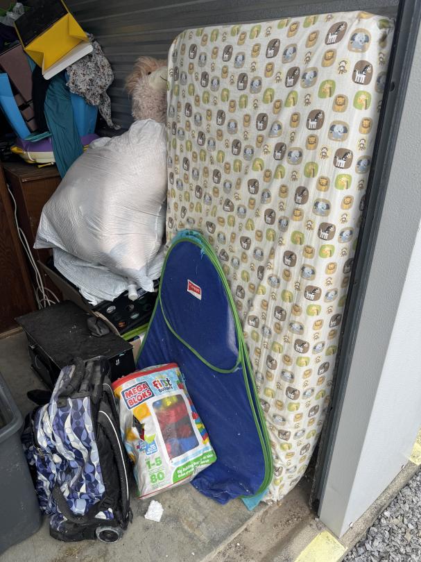 This unit appears to contain…Organized unit. Baby mattress. Kid's toys. Wooden bed frame. Dresser. Chest. Kitchenware. Clothes. Bags. Totes. Microwave. Christmas decor. Backpack.