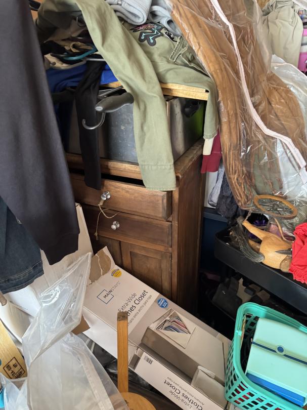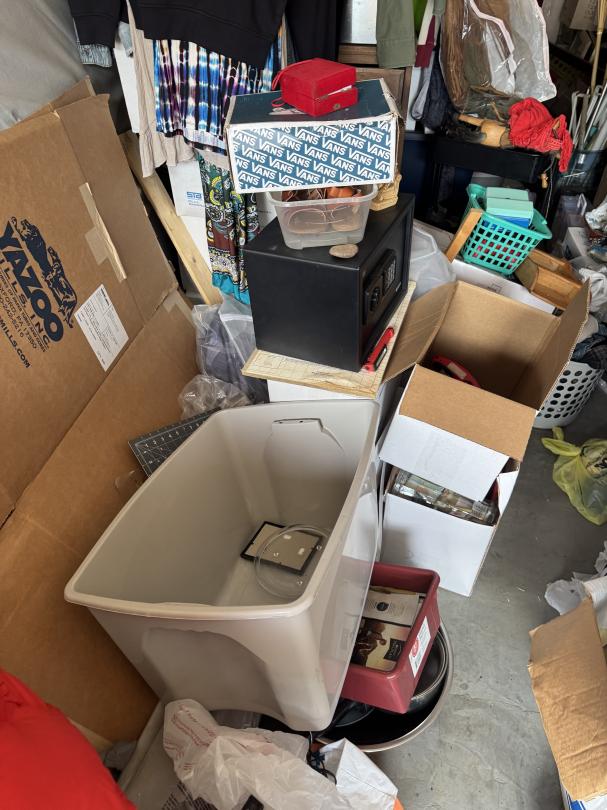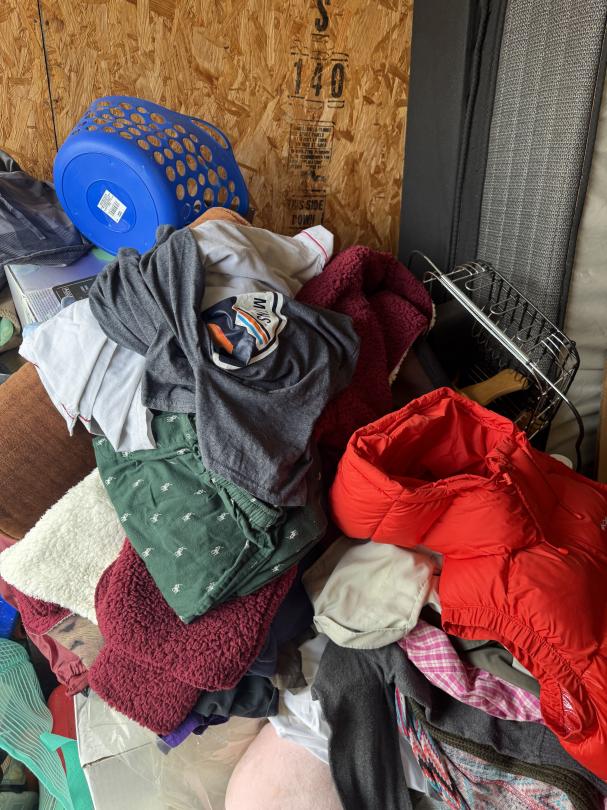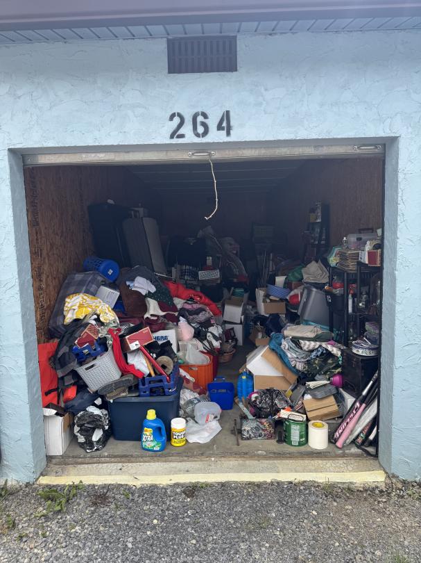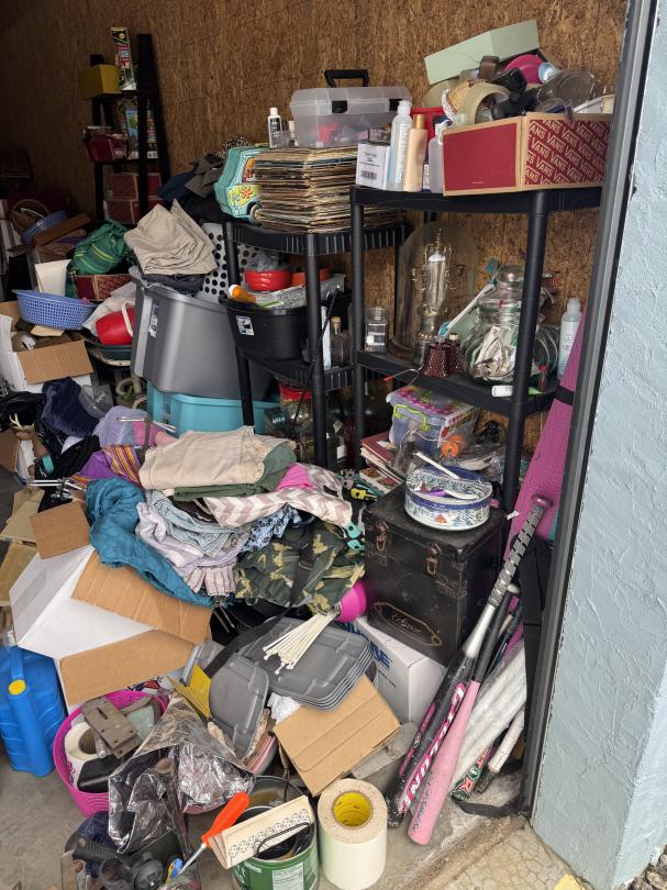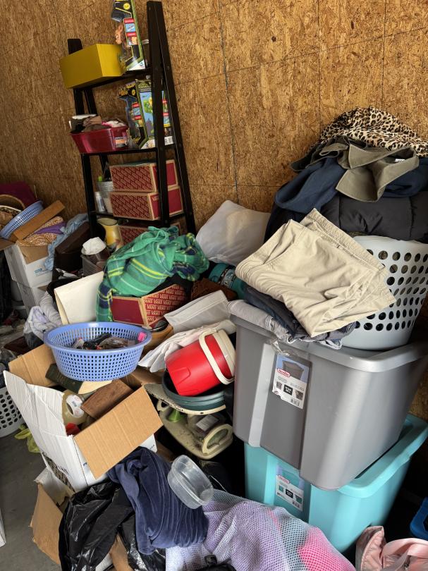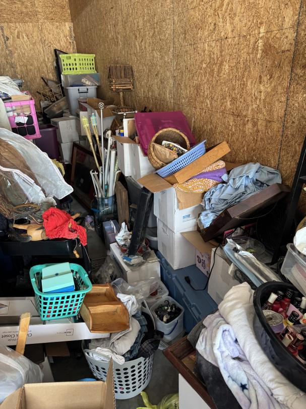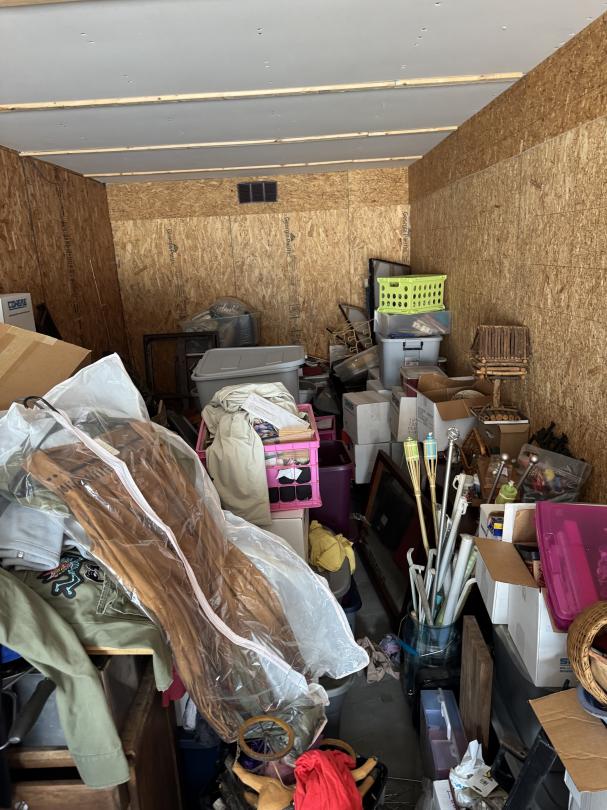 This unit appears to contain…Full unit. Clothes. Totes. Baskets. Blankets. Shoes. Lawn chairs. Shelves. Mattress. Home decor. Sports equipment. Kitchenware. Pillows. Bags. Dresser. Boxes. Mirror. Curtain rods. Deep fryer. Safe.