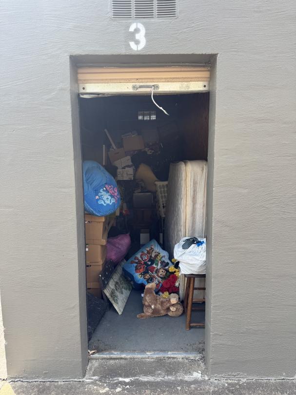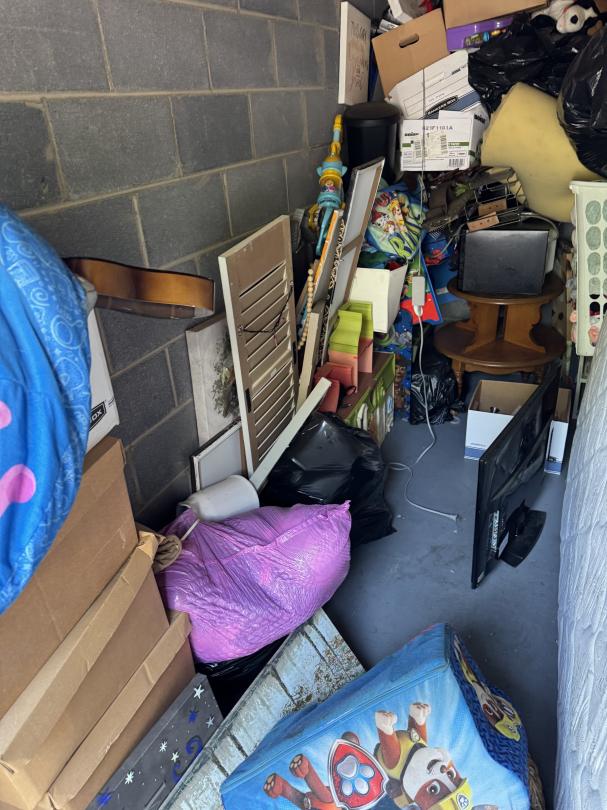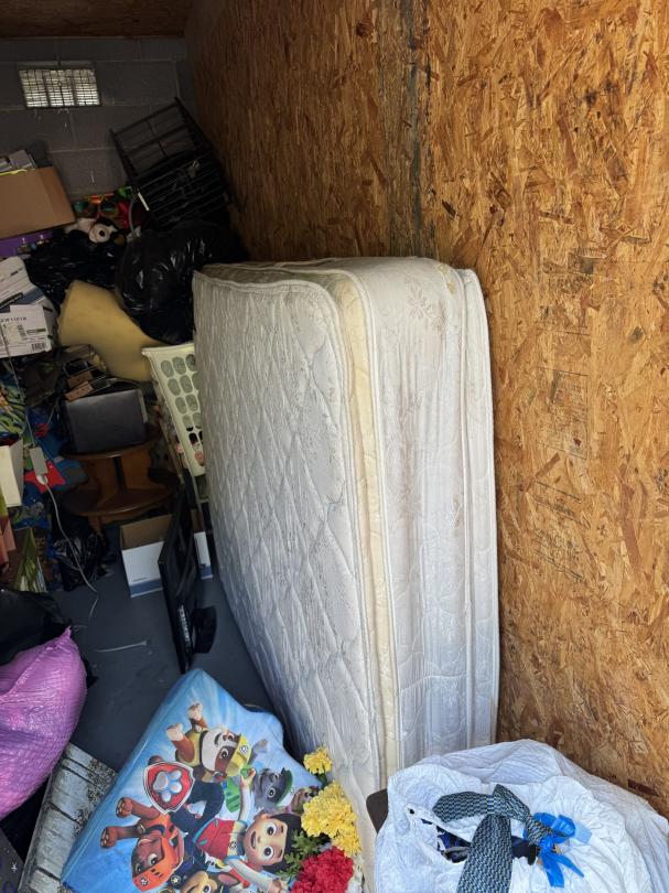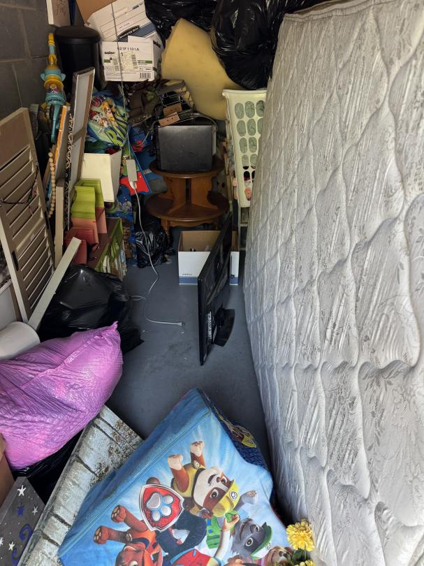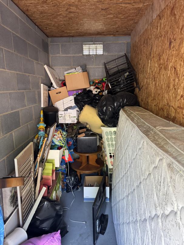 This unit appears to contain…Full unit. Home decor. Kid's items. Mattress. Stools. Boxes. Hampers. Stuffed toys. Small table. Doll house. Microwave. TV. Tool box.