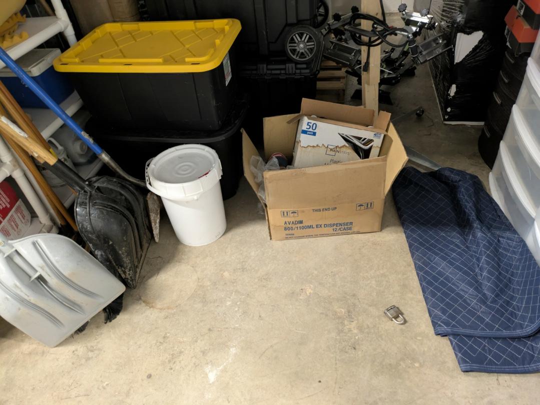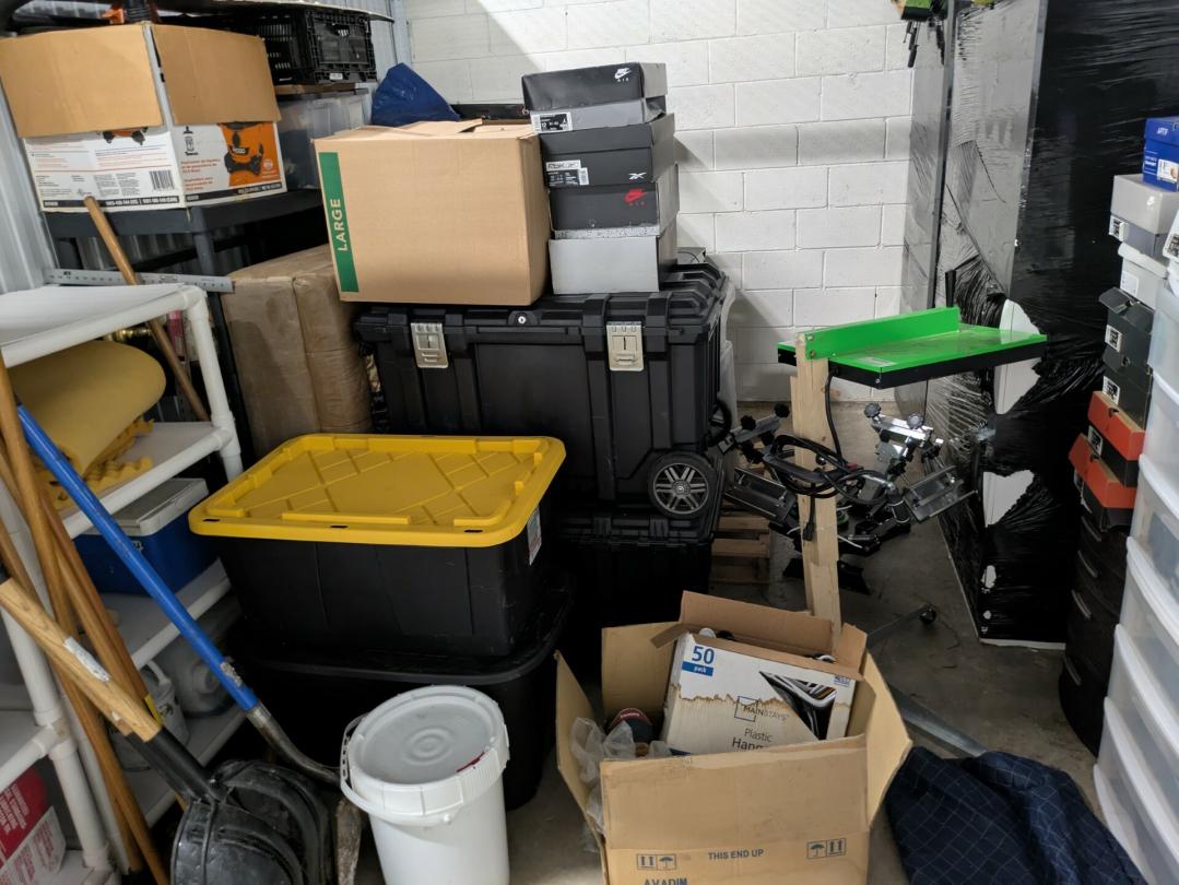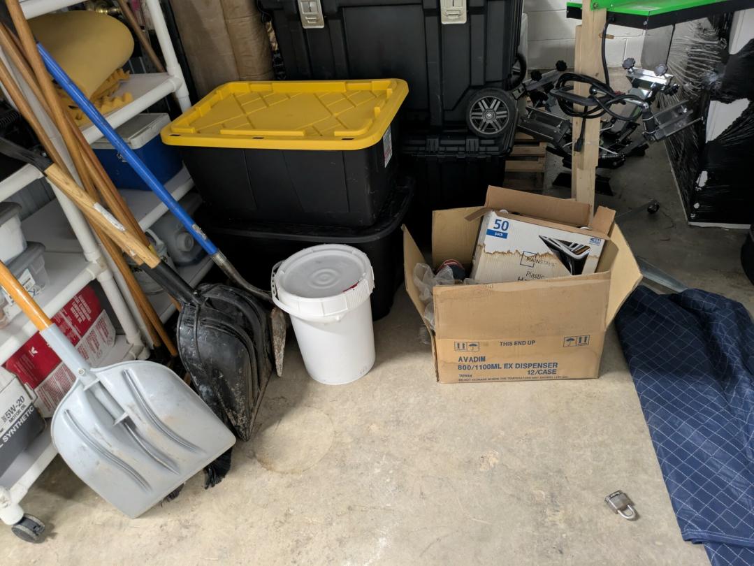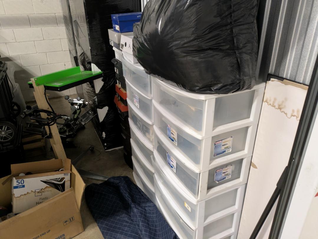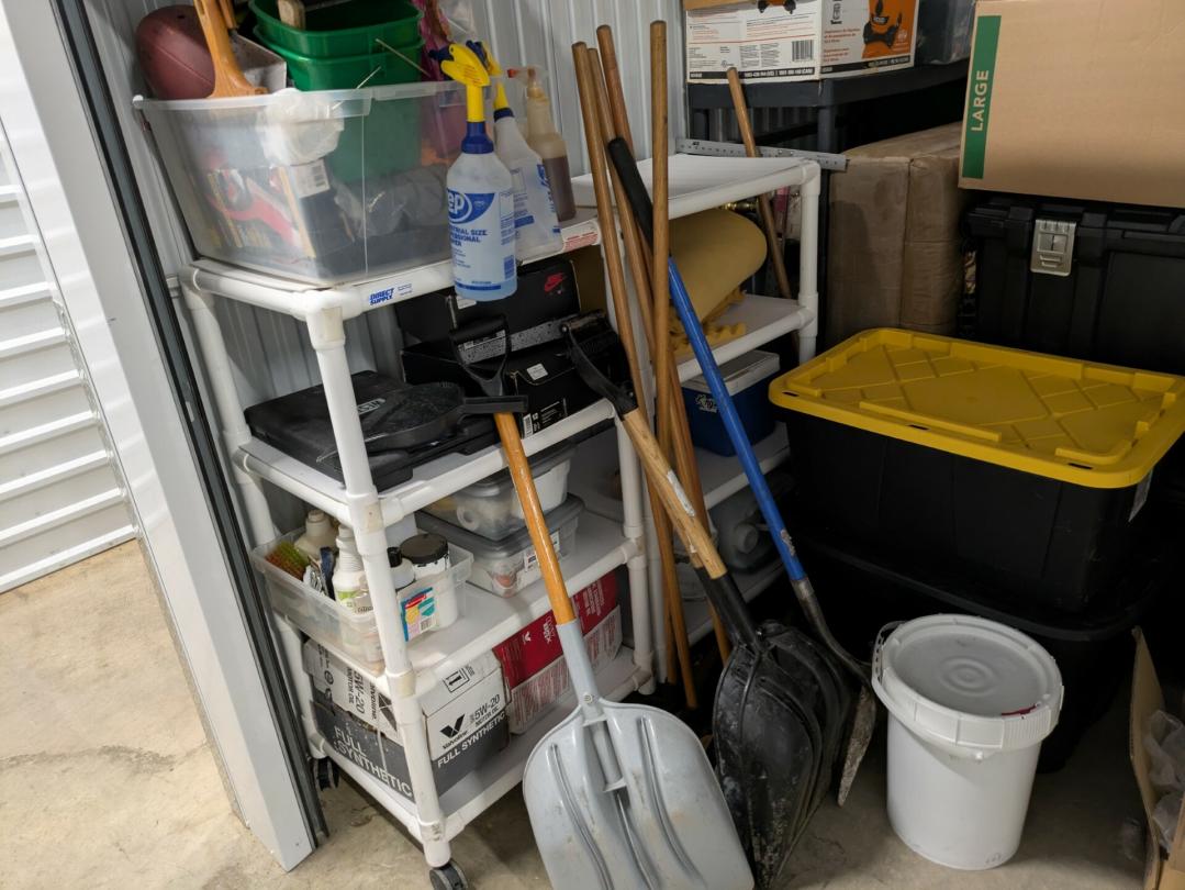 This unit appears to contain…tools, plastic containers, mis. .boxes, clothing, cleaning supplies, misc. items