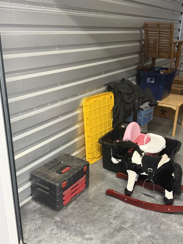 This unit appears to contain…Climate unit appears to contain Vacuum, toolbox with tools, flat screen tv, shelving, table, chair, end table, dvds, sealed boxes, clothing, child toys