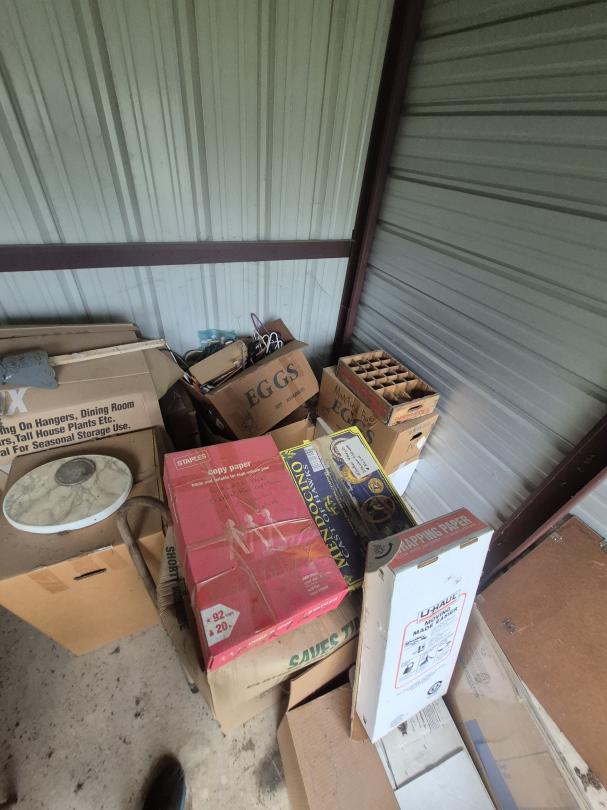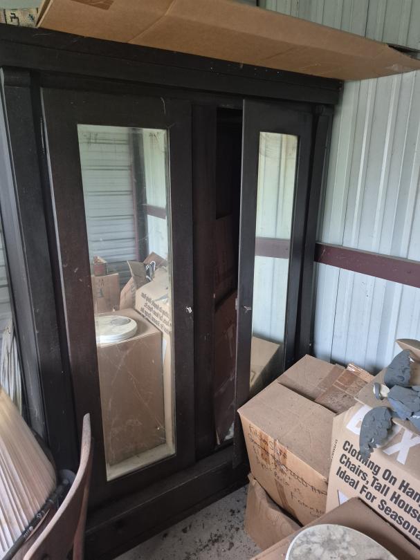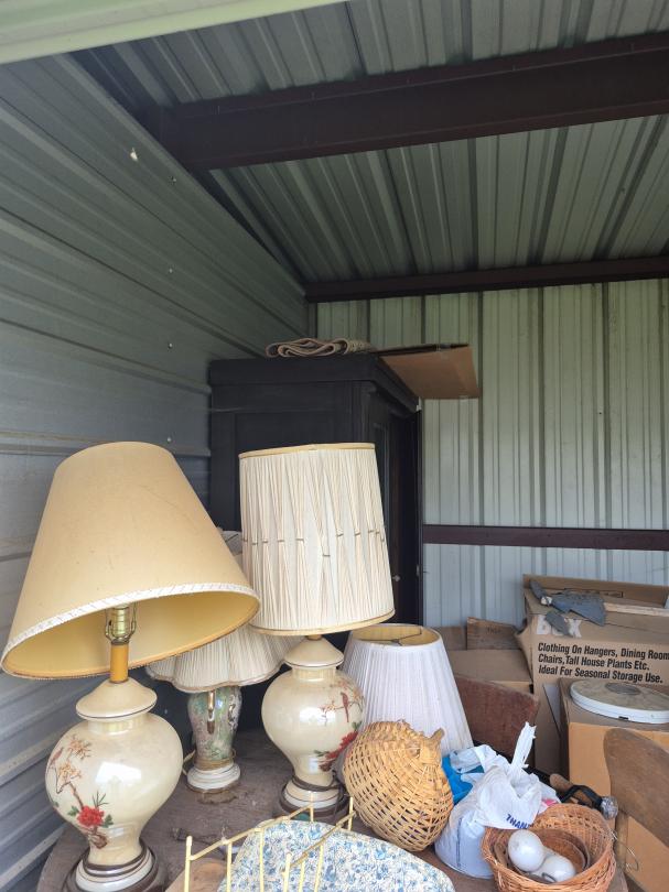 This unit appears to contain…Various lamps, wooden kitchen table and chairs, boxes of various household items, wooden wardrobe