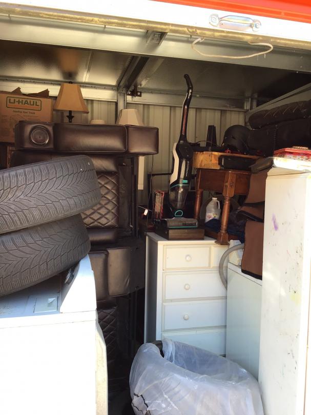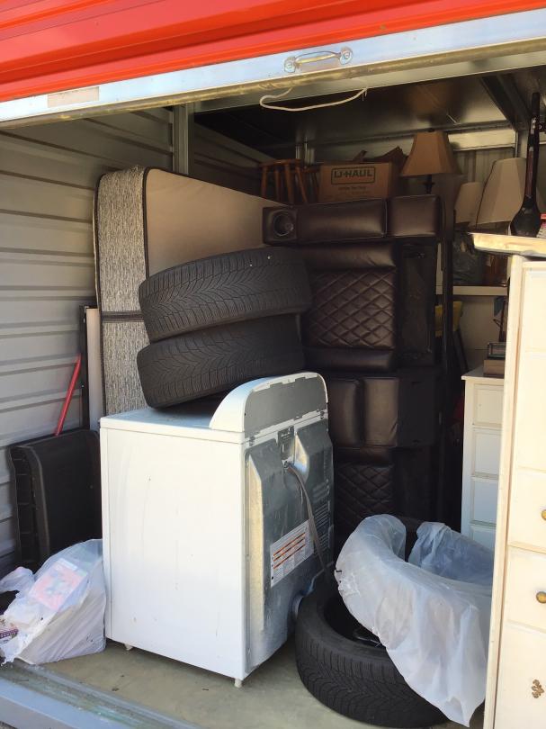 This unit appears to contain…10x10x9 Drive Up 1st Floor Outside Level No Climate. Unit appears to contain dryer/washer, dresser, tires, vacuum, couch, mattress, lamps, stools, boxes, hutch, timberland shoe box, video games.