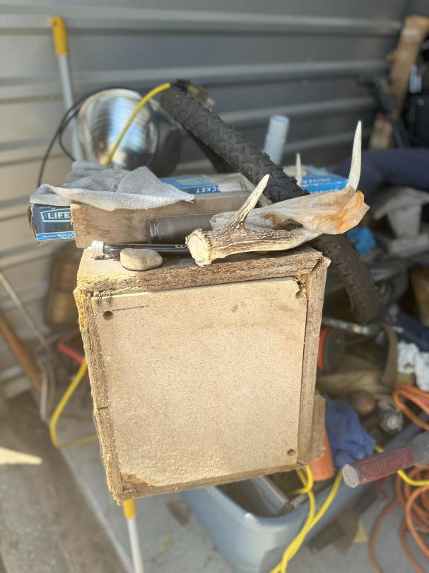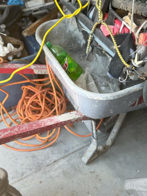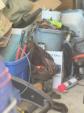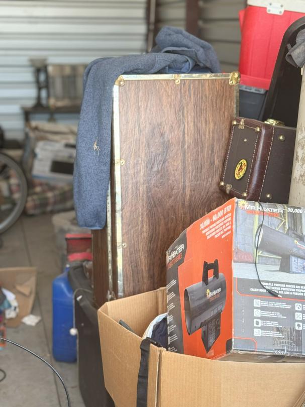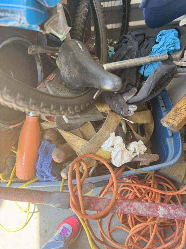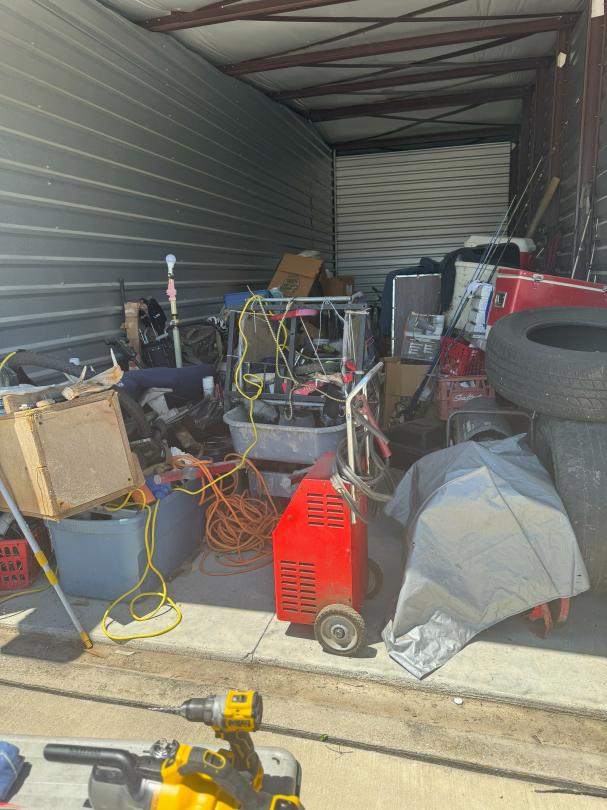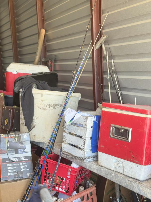 This unit appears to contain…shop tools / tires / portable batterie charger / bolt cutters bikes / cooler / fishing poles / golf clubs / propane tank heater / chest / tool bag / wheel barrel / lamps / clothes boxes & totes w/misc. items