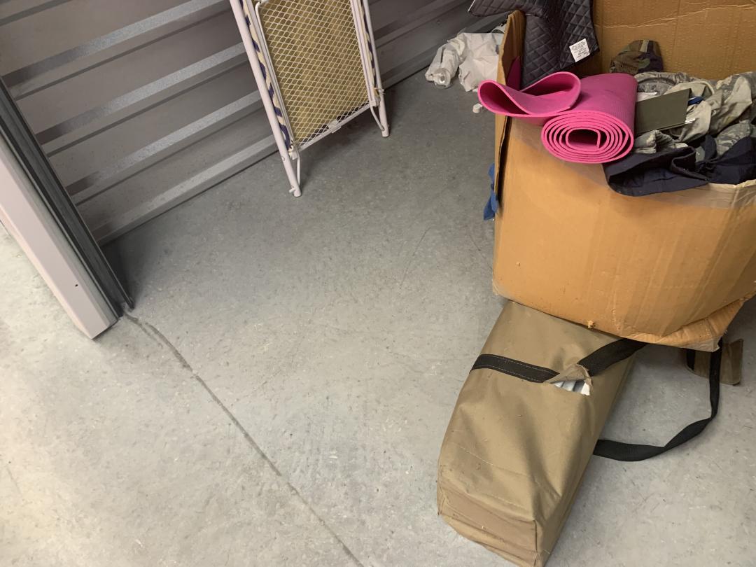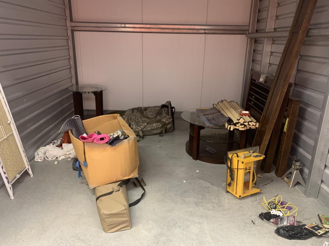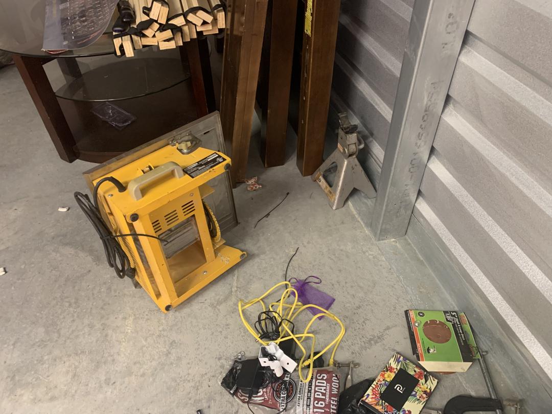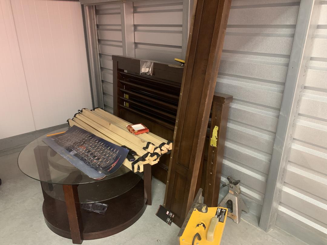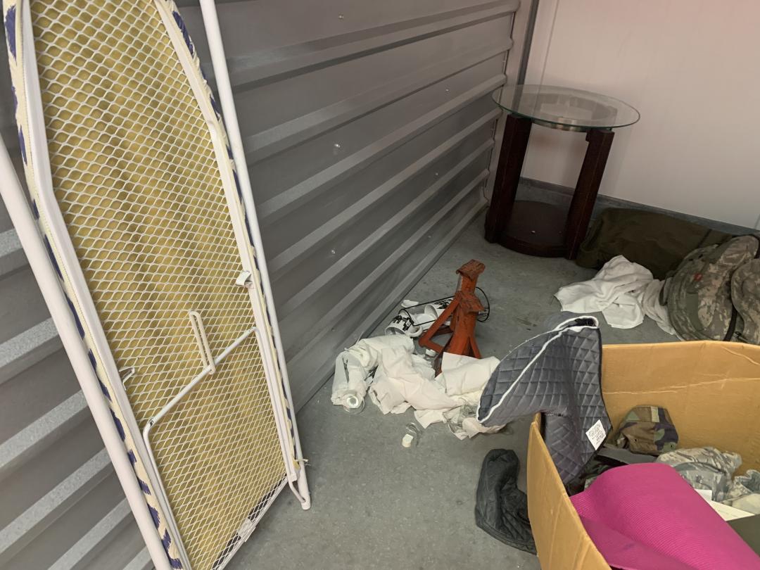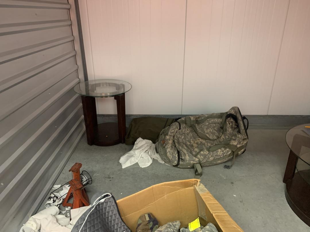 This unit appears to contain…Coffee table, box, tent, bed frame, garment, bag, , tile, cutter, car jacks, end table, 1- duffel bag, ironing board