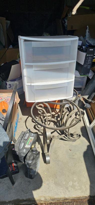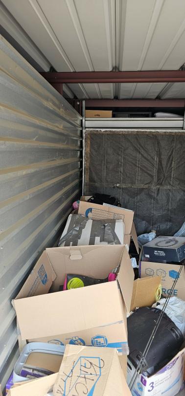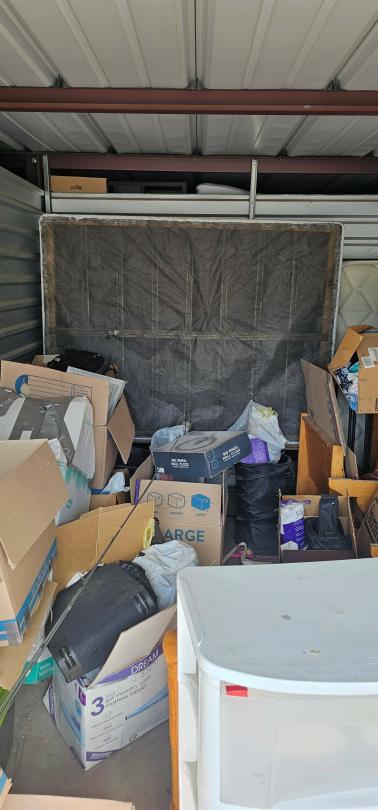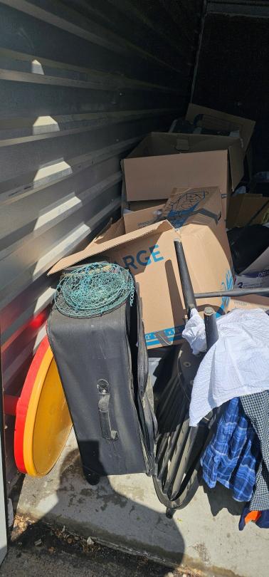 This unit appears to contain…Clothes luggage boxes mattress set Kids toys wrought Iron tables fishing gear