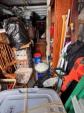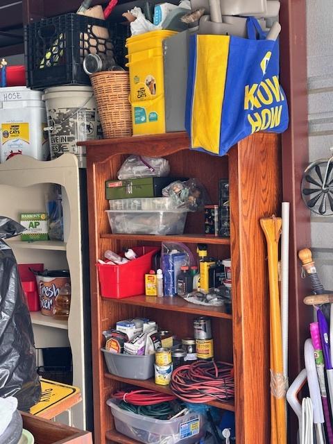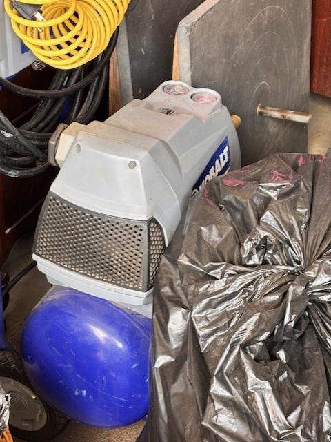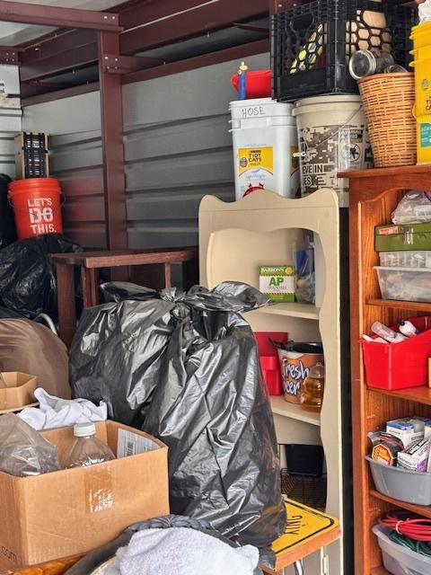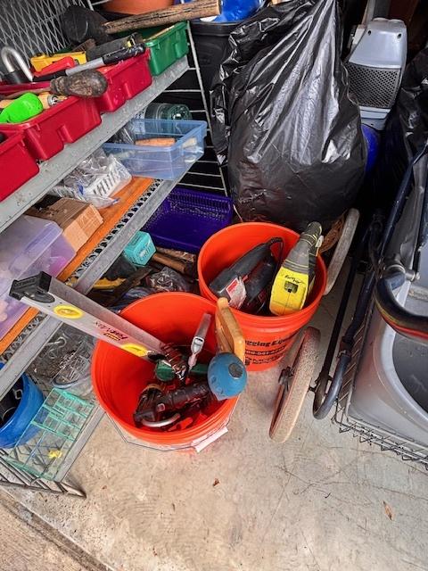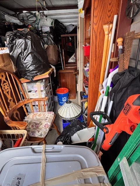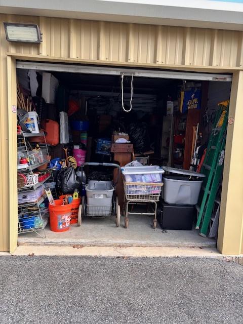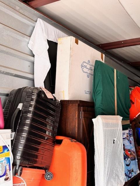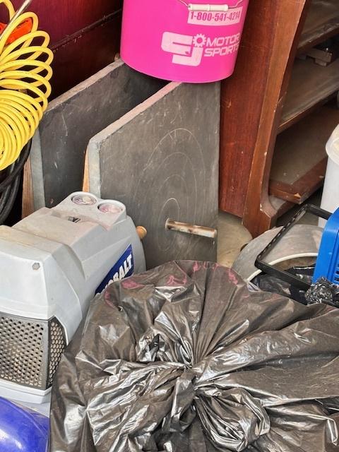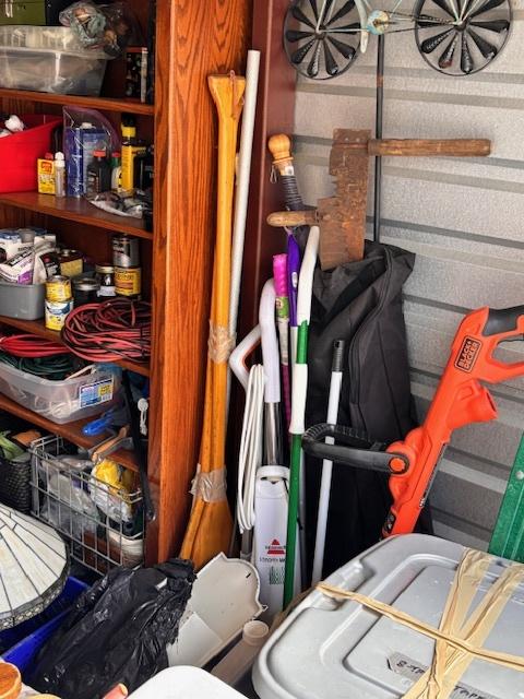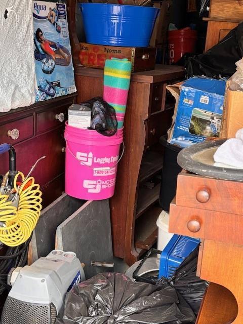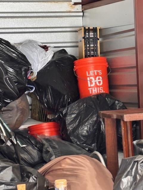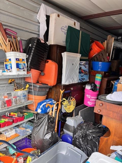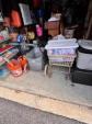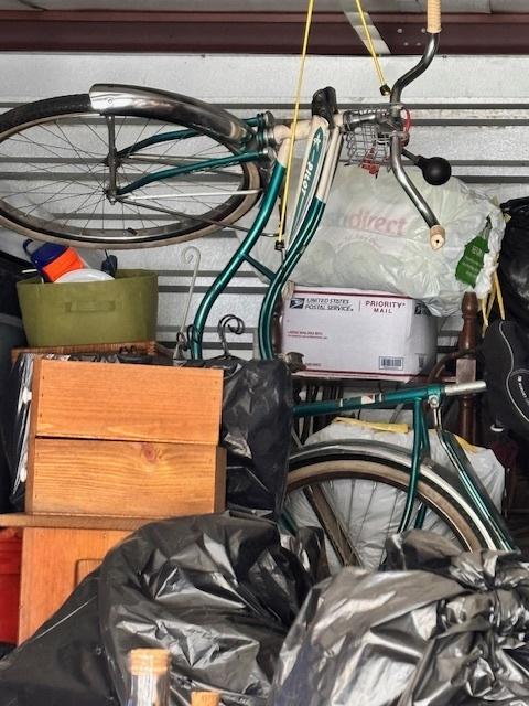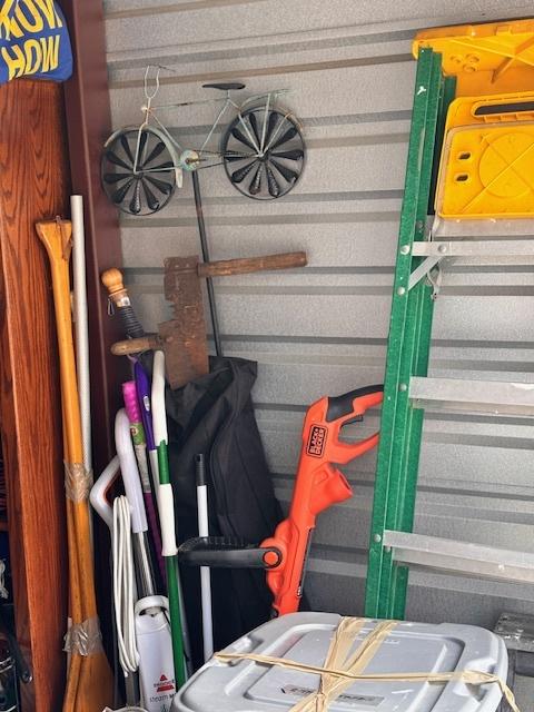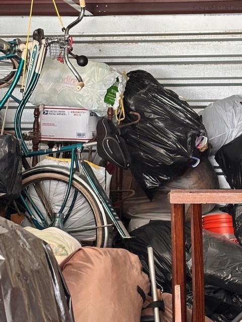 This unit appears to contain…Drive-Up Unit Appears to contain: laundry carts, Dyna-Glo Delux heater, luggage, pots, walking canes, dressers, quoits, Pilot bicycle, book cases, oars, two-man saw, Bissell steam mop, Black & Decker weed eater, ladders, safe, hand tools, chairs, lamp, Kobalt portable compressor, totes, boxes, bags, 6 drawer craft cart, buckets, wall art, outdoor decor
