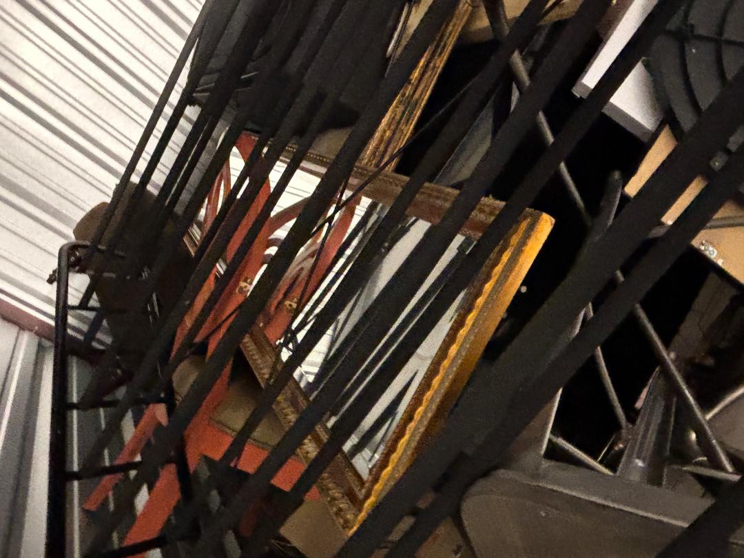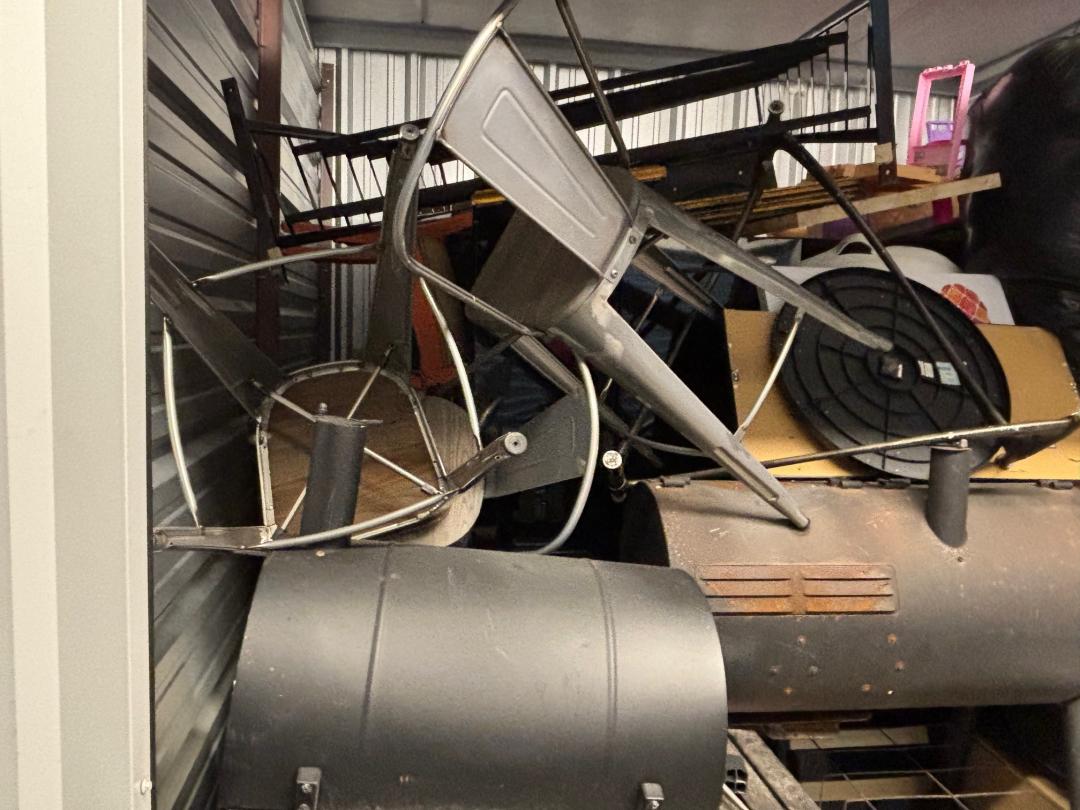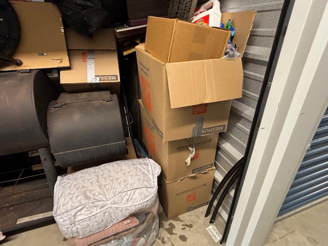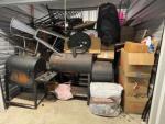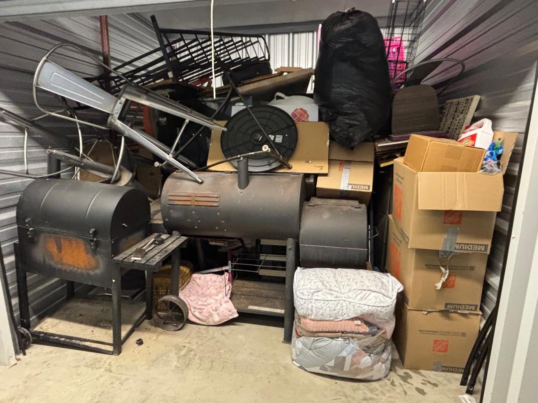 This unit appears to contain…Bed Frame, Boxes, Chairs, Clothing, Grill, Mirrors, and Refrigerator