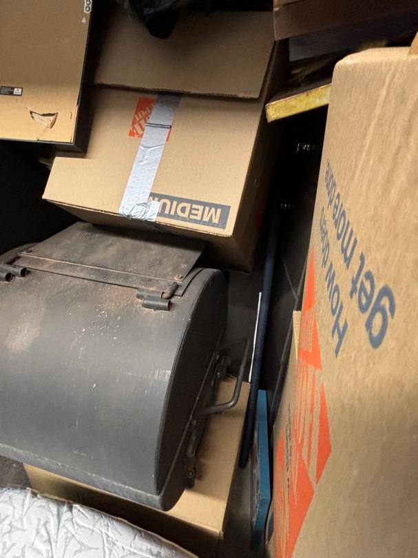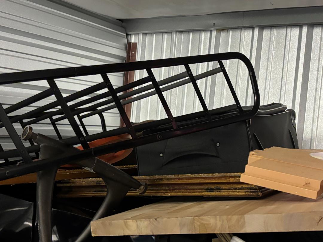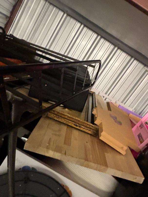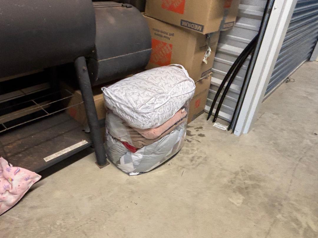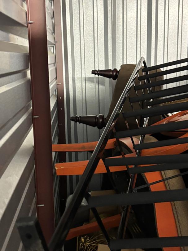 This unit appears to contain…Bed Frame, Boxes, Chairs, Clothing, Grill, Mirrors, and Refrigerator