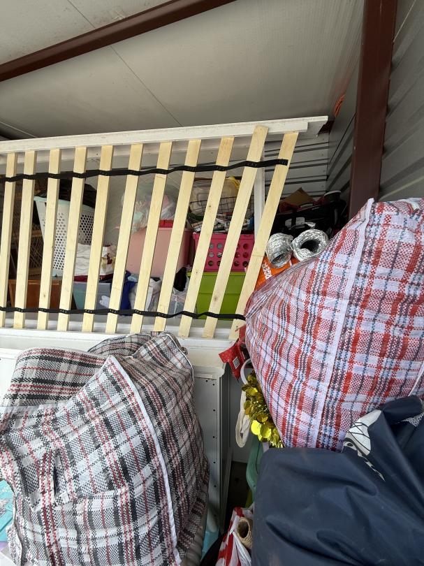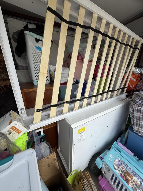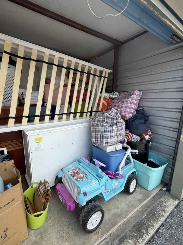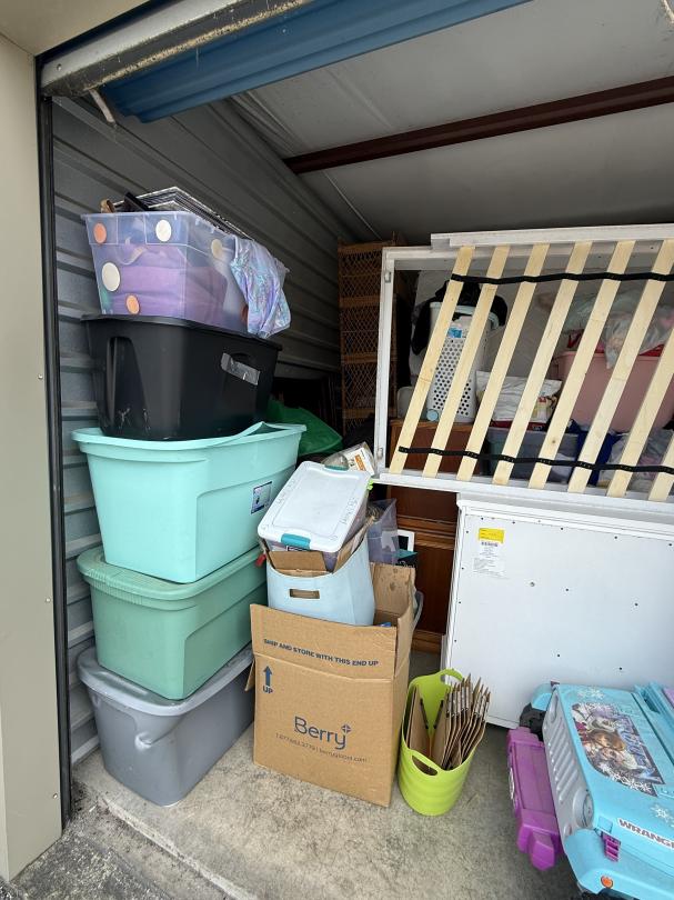 This unit appears to contain…Totes, kid toys, bed frame, dresser