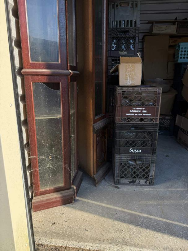 This unit appears to contain…24/7 Access, Drive Up Access, Fenced & Gate, Premium Glass cabinets, dresser, glass jars, milk crates
