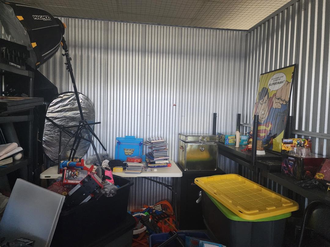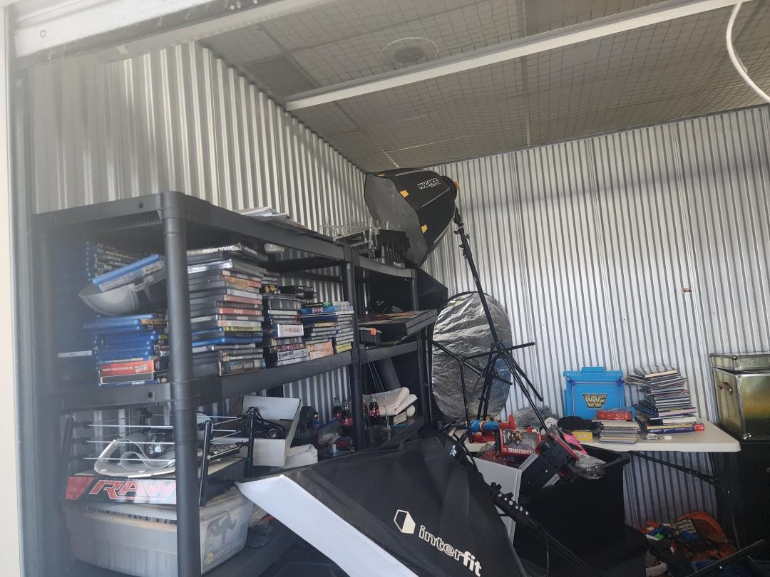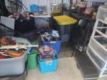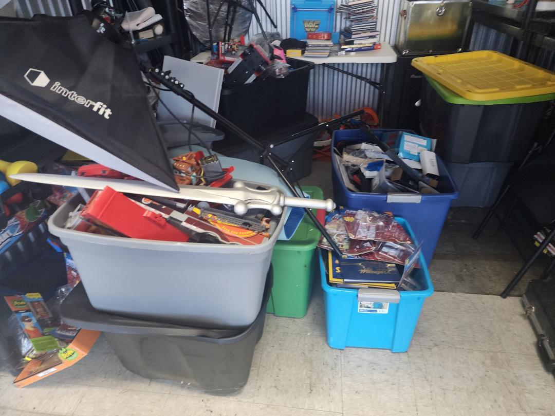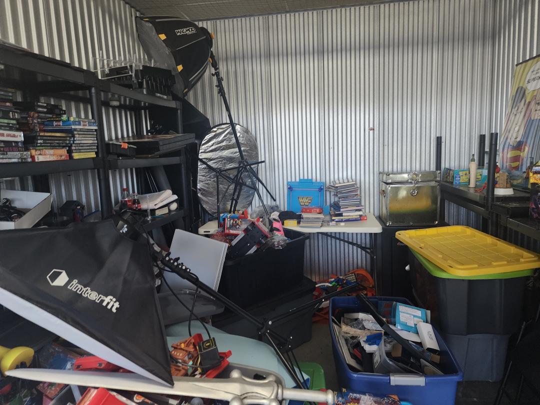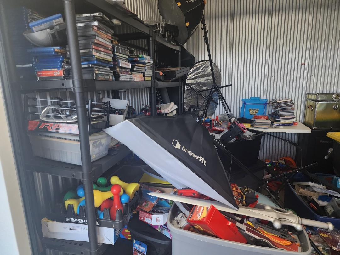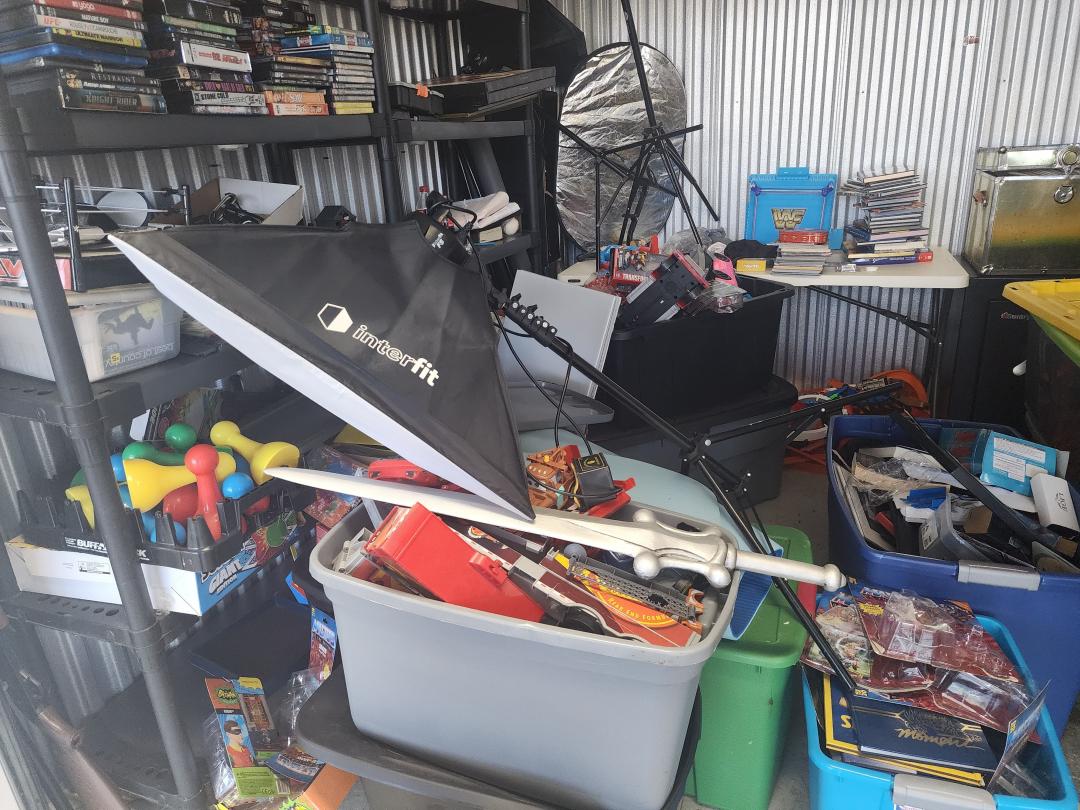 This unit appears to contain…camera accessories, shelves, totes, safe, chair, toys and other misc items