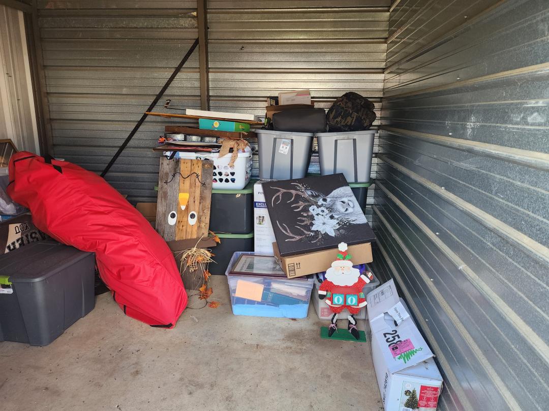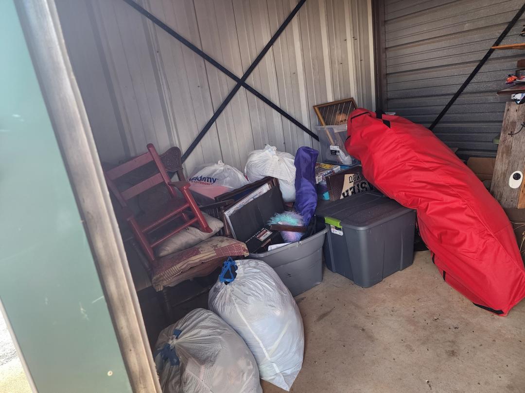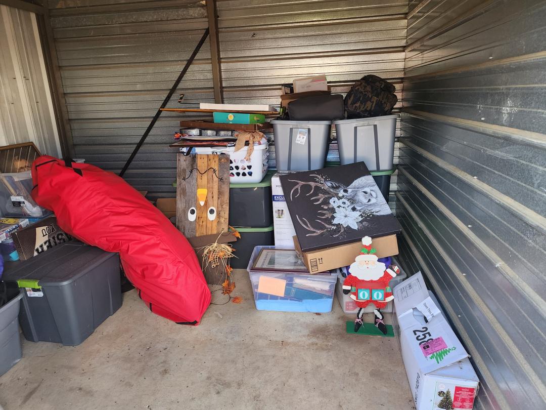 This unit appears to contain…totes, christmas tree, chair, bags, and other misc items