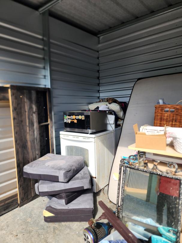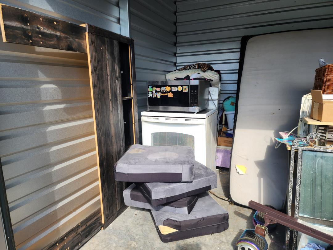 This unit appears to contain…stove, desk, tools, microwave, bed, and other household items