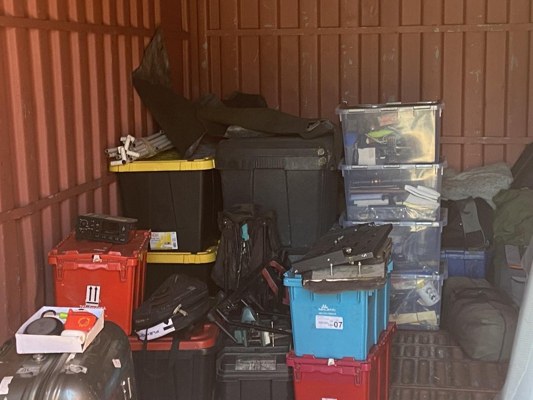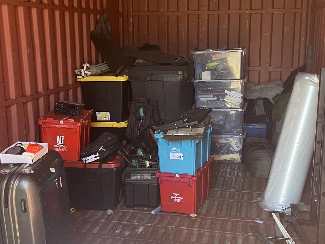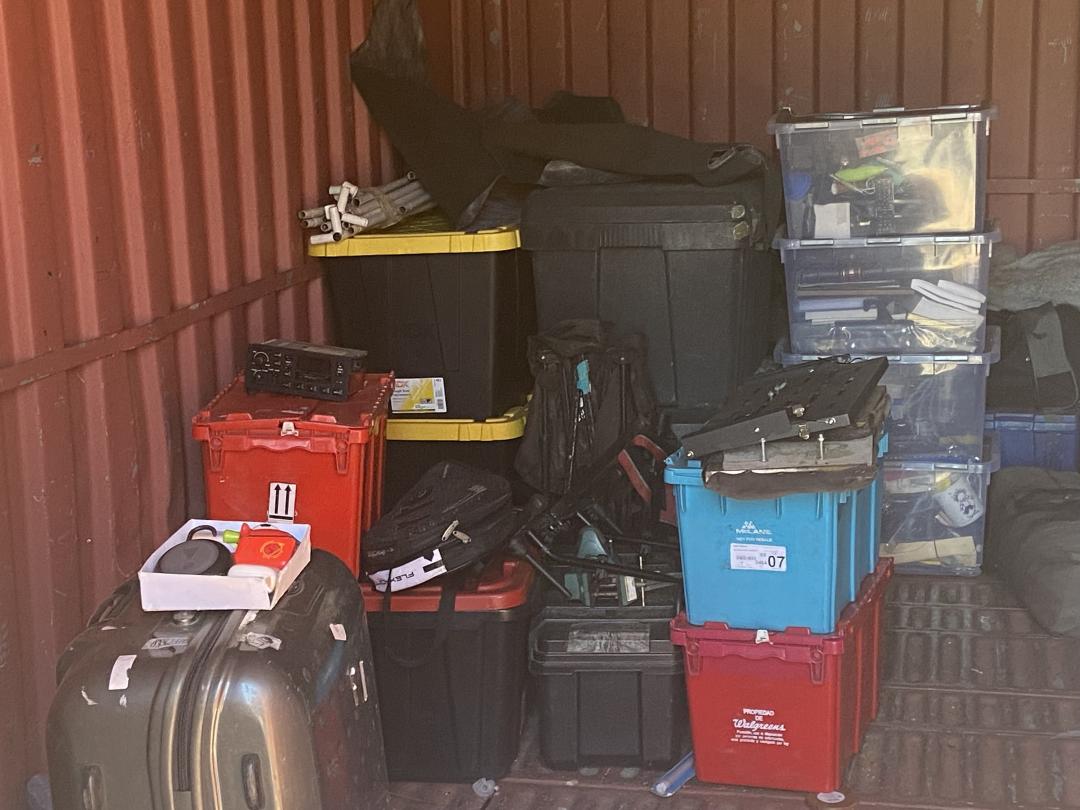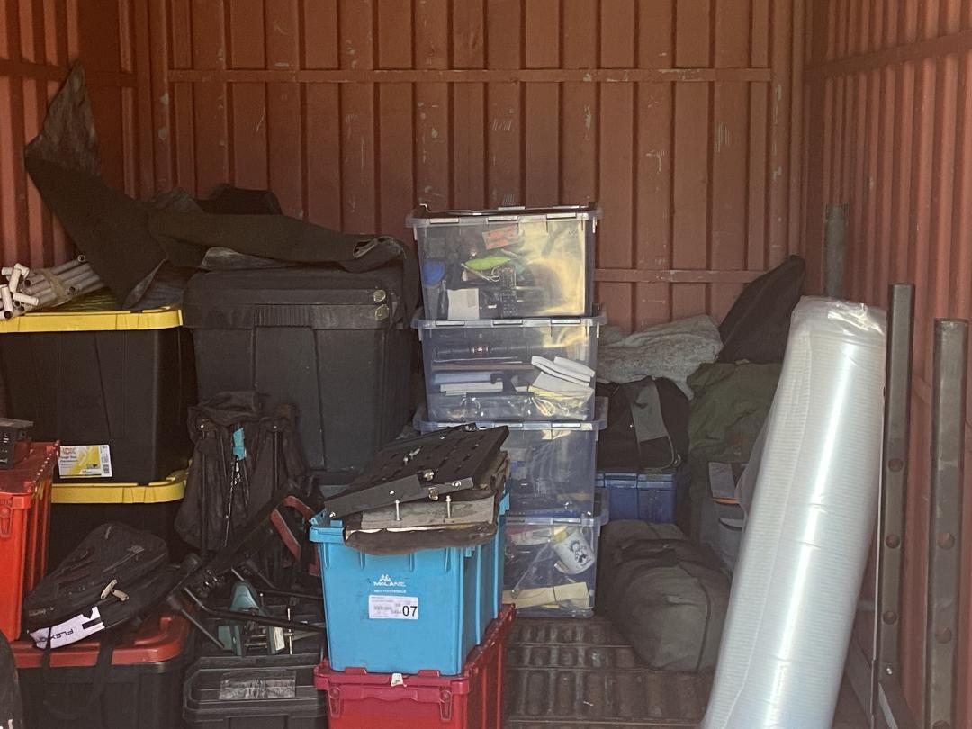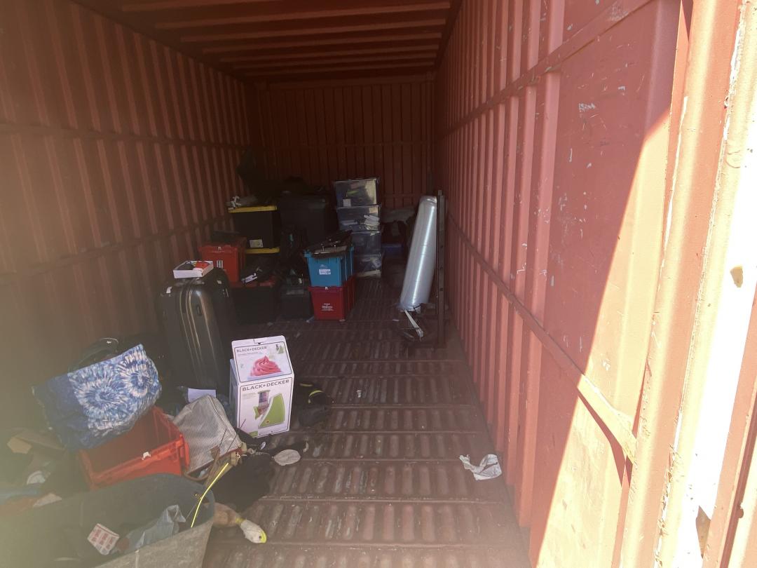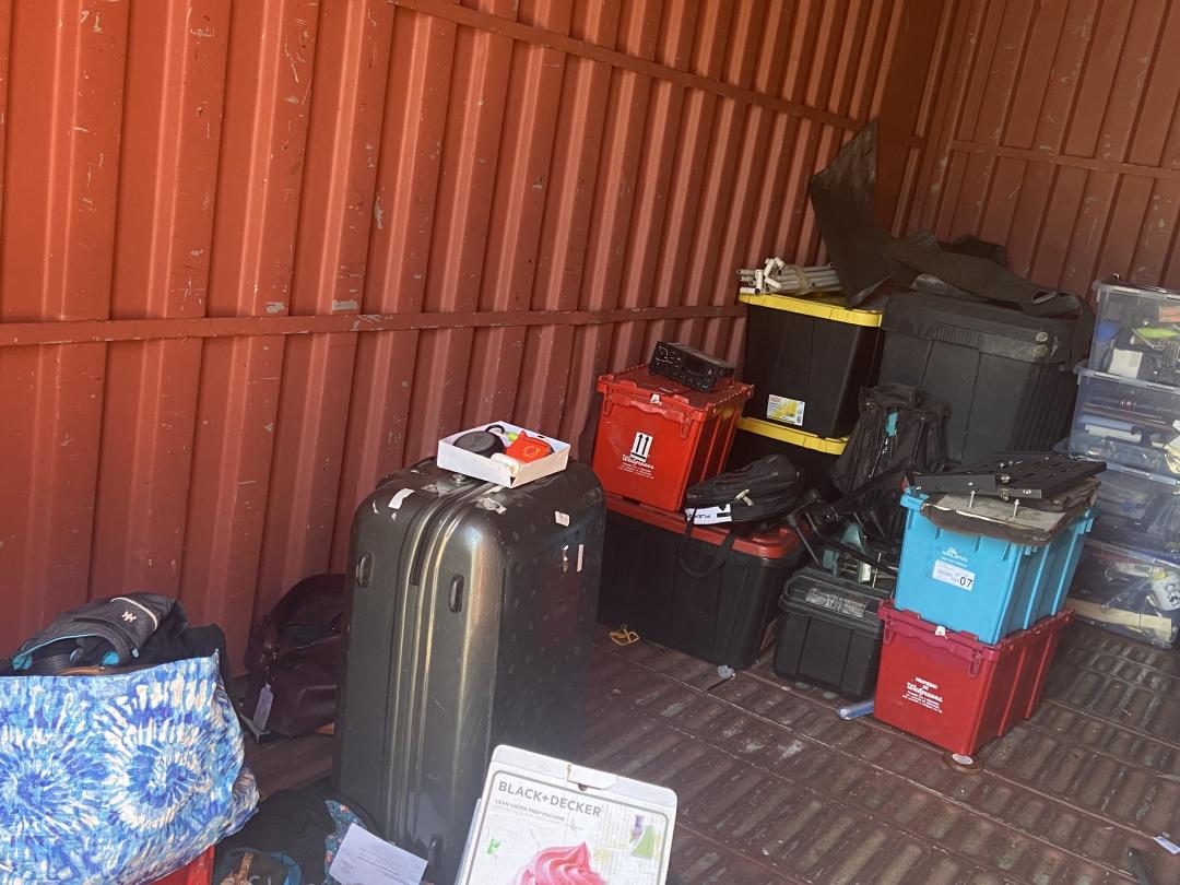 This unit appears to contain…Plastic Totes, Books, Luggage, Bags