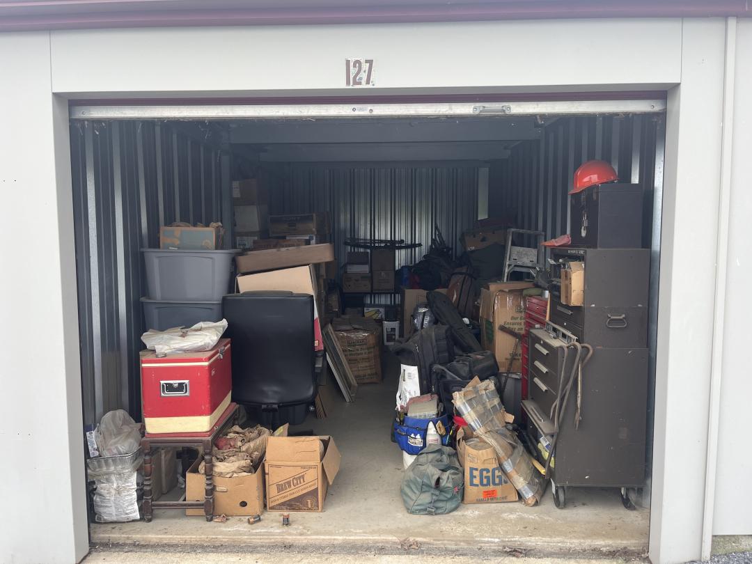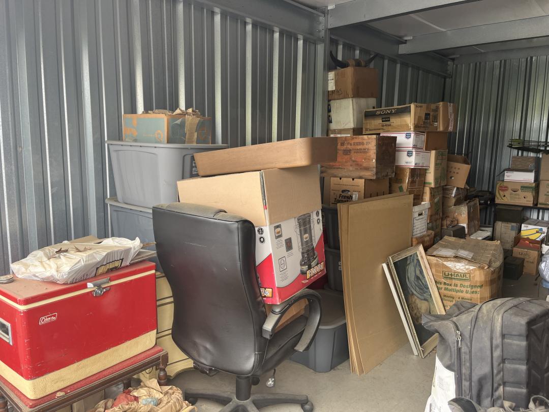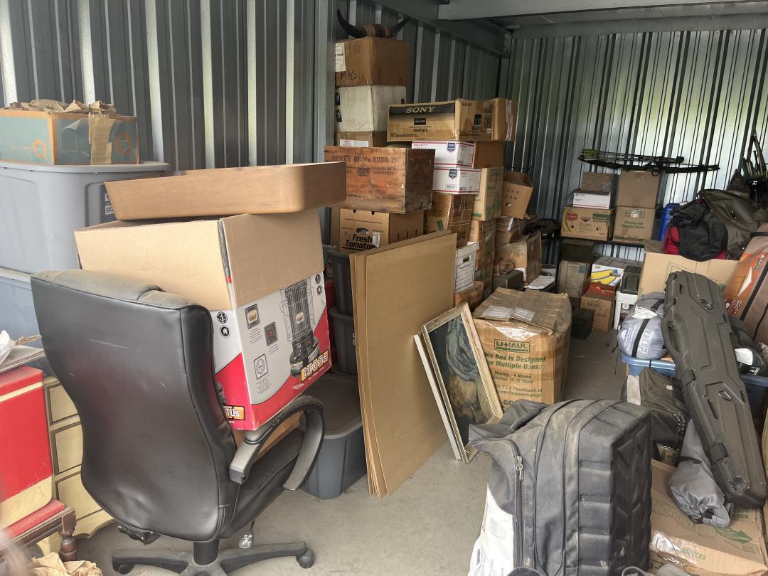 This unit appears to contain…BB gun, safe, hunting gear, outdoor equipment, tent, saw, ladder, boxes, bow and arrows, tools, chair, totes, decor, records, antique wooden box, bull horn decor, ammo containers