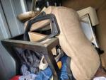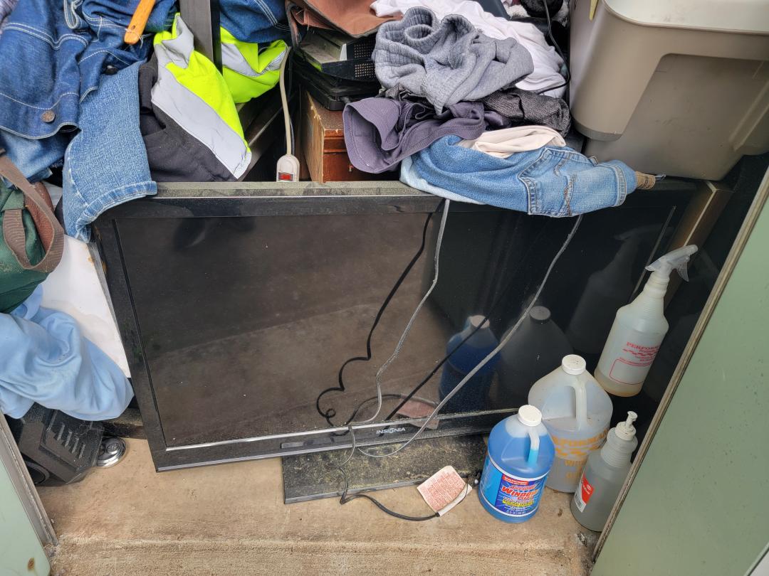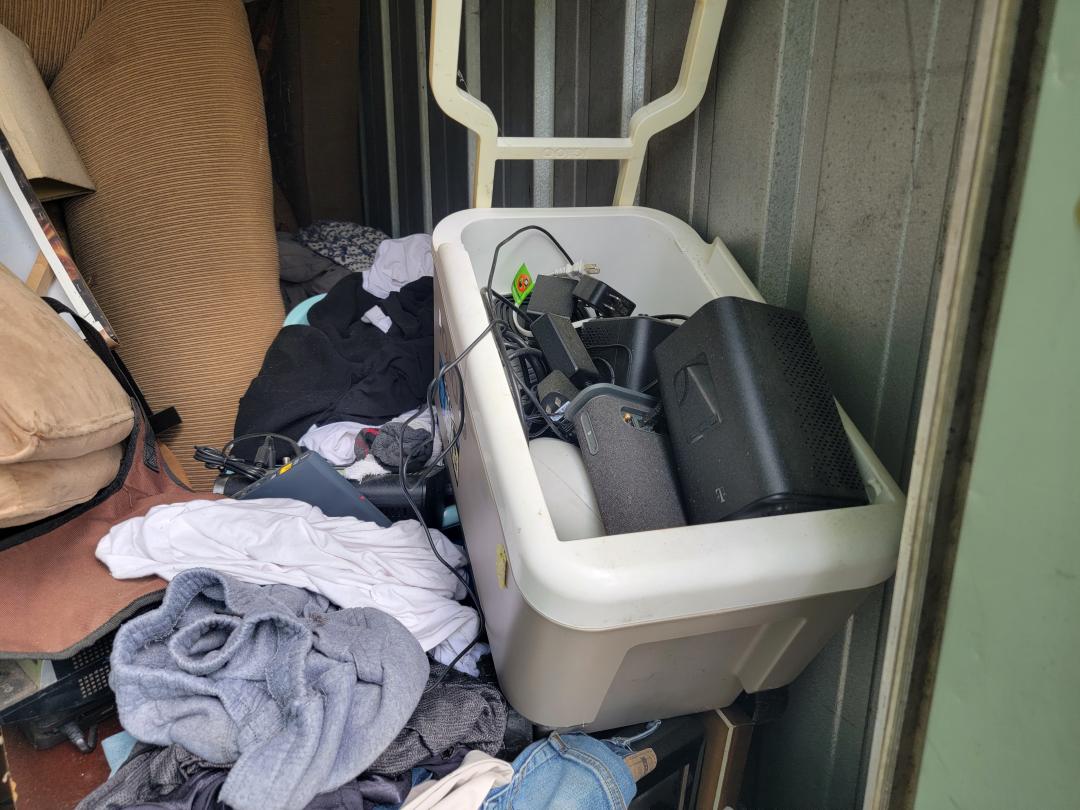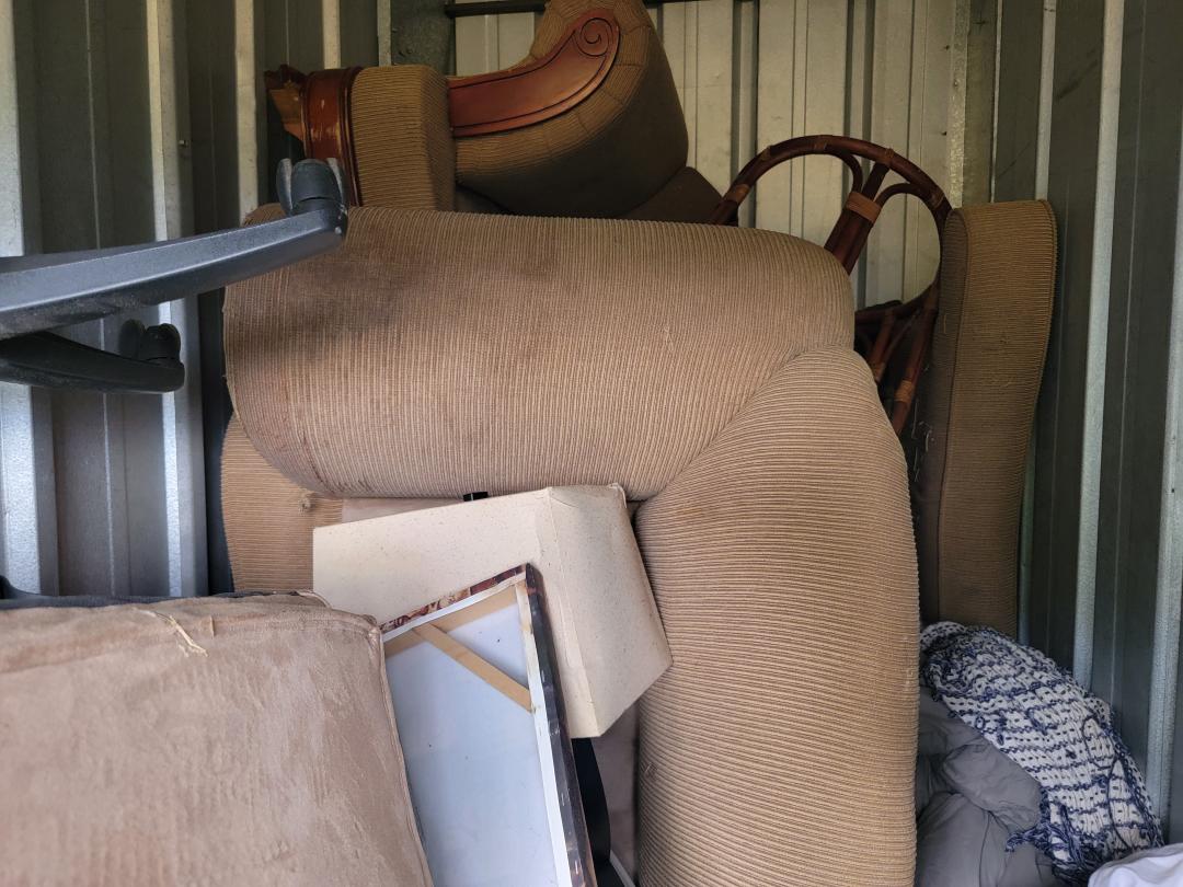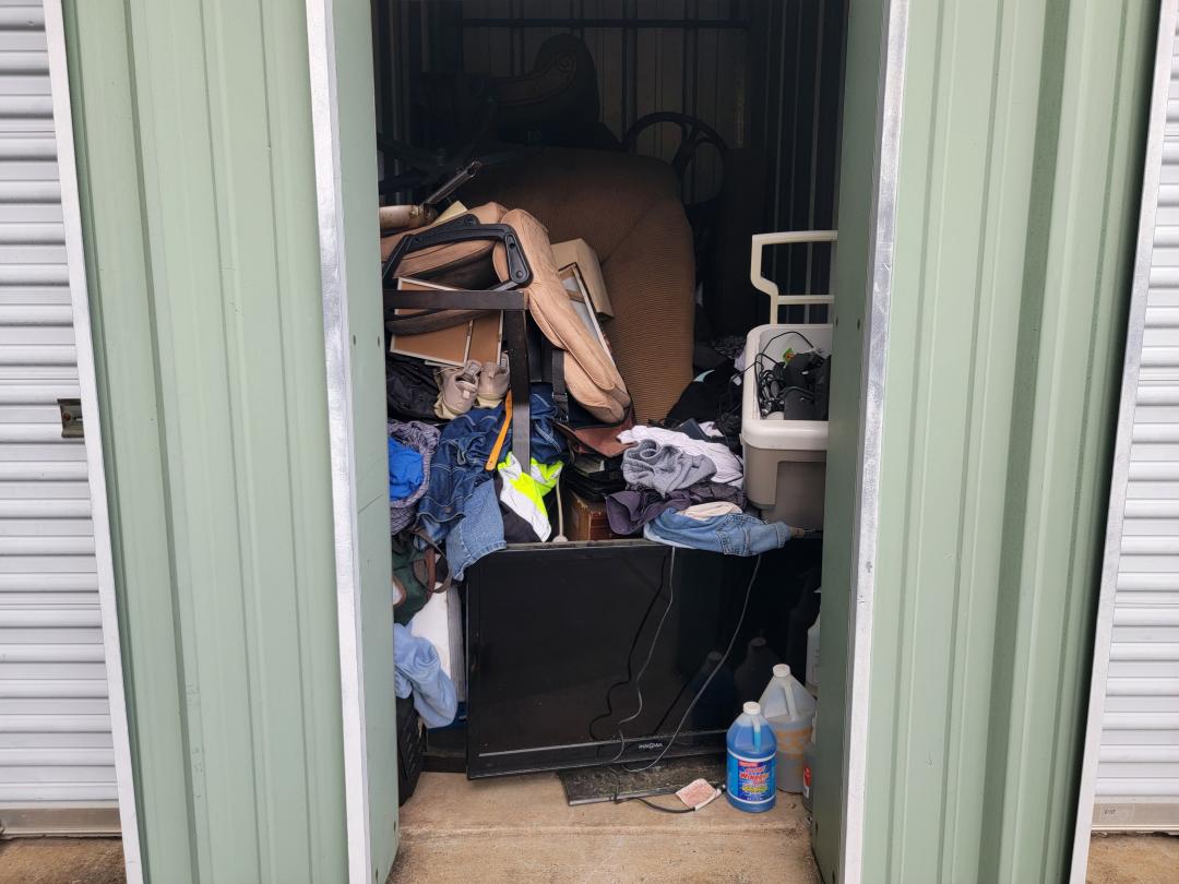 This unit appears to contain…household items, couch, tv, chairs, loveseat, clothes