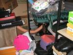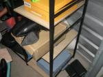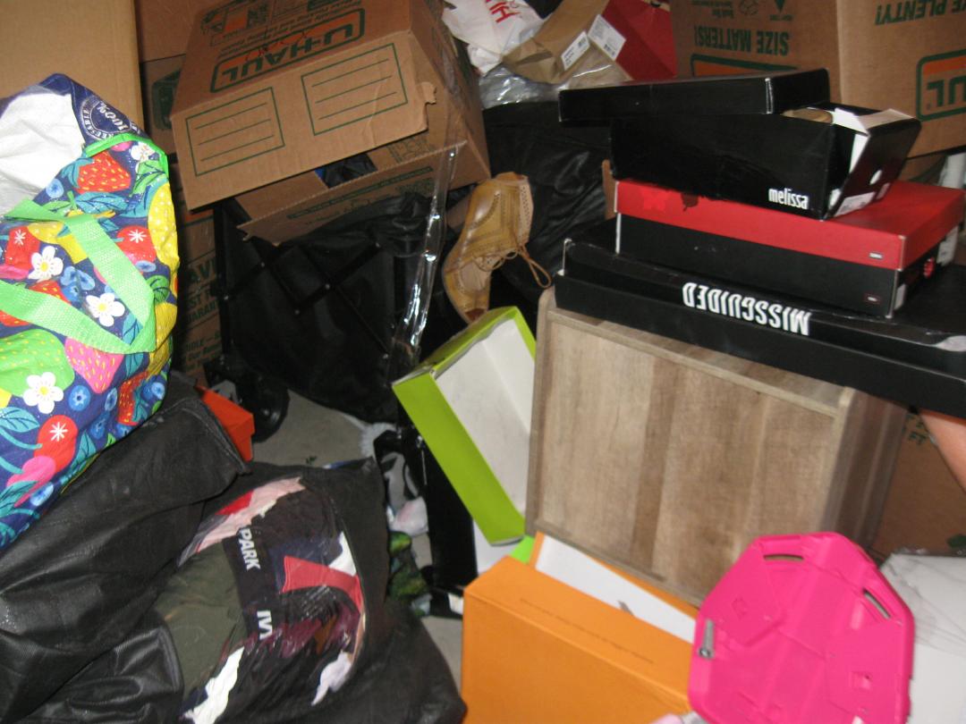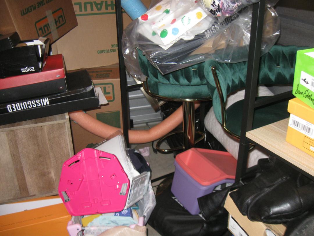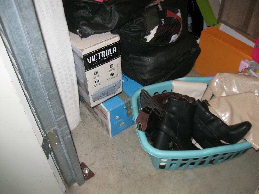 This unit appears to contain…Shelves, stools (2), shoes, bags, clothes, boxes, mattress, record player