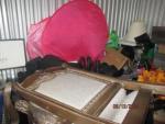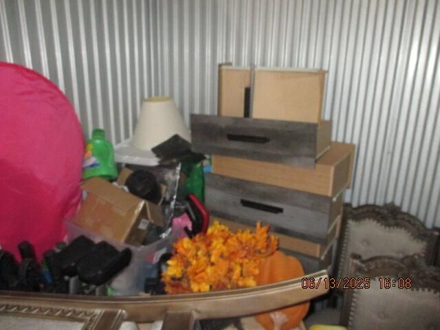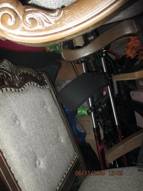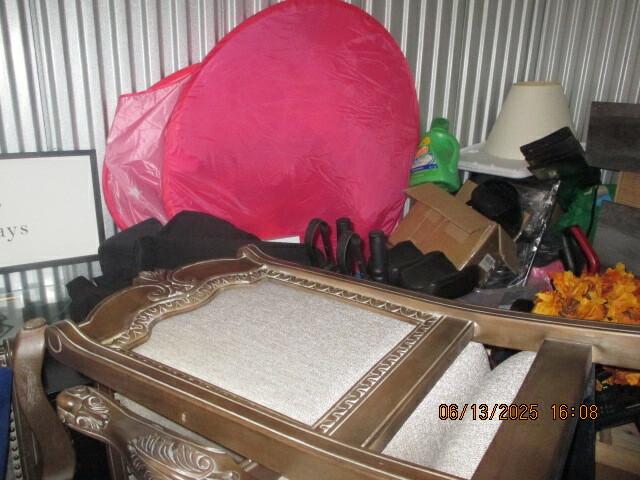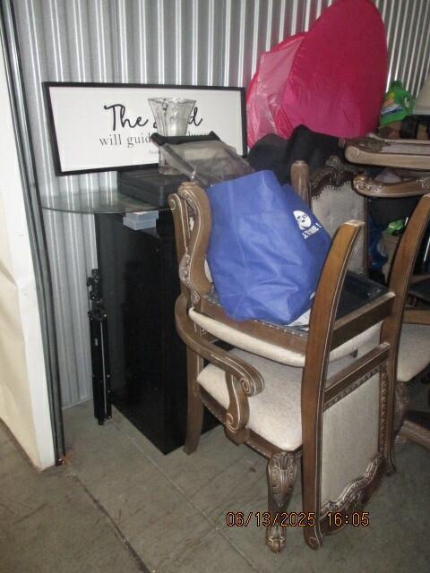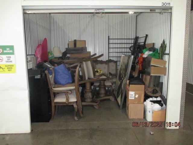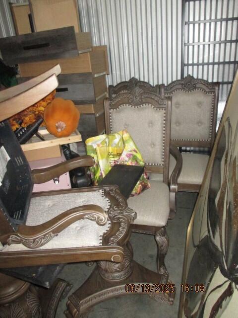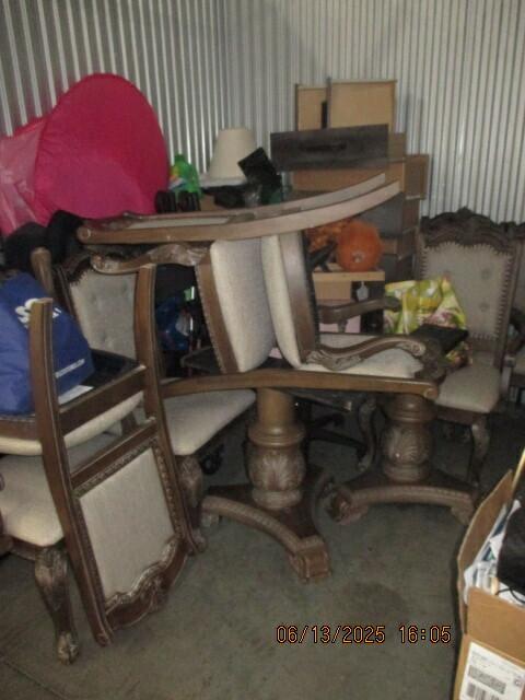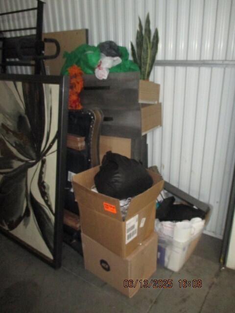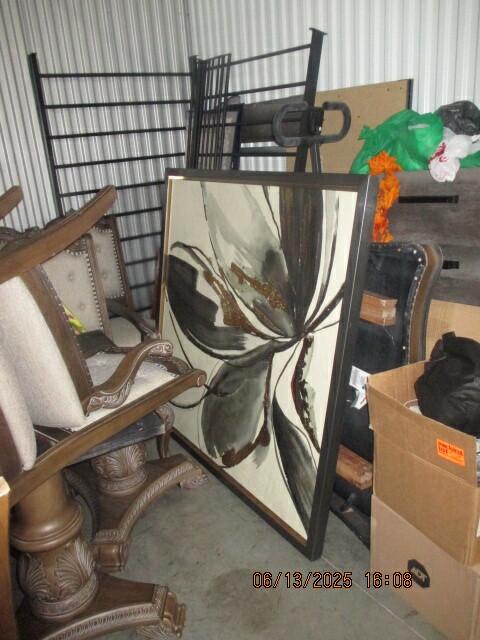 This unit appears to contain…Wall Art, Kitchen Chairs, Kitchen Table, File Cabinet, Decor, Workout Equipment, Faux Plants, Walker, Bedframe, Dressers, Tripod, Boxes, Totes