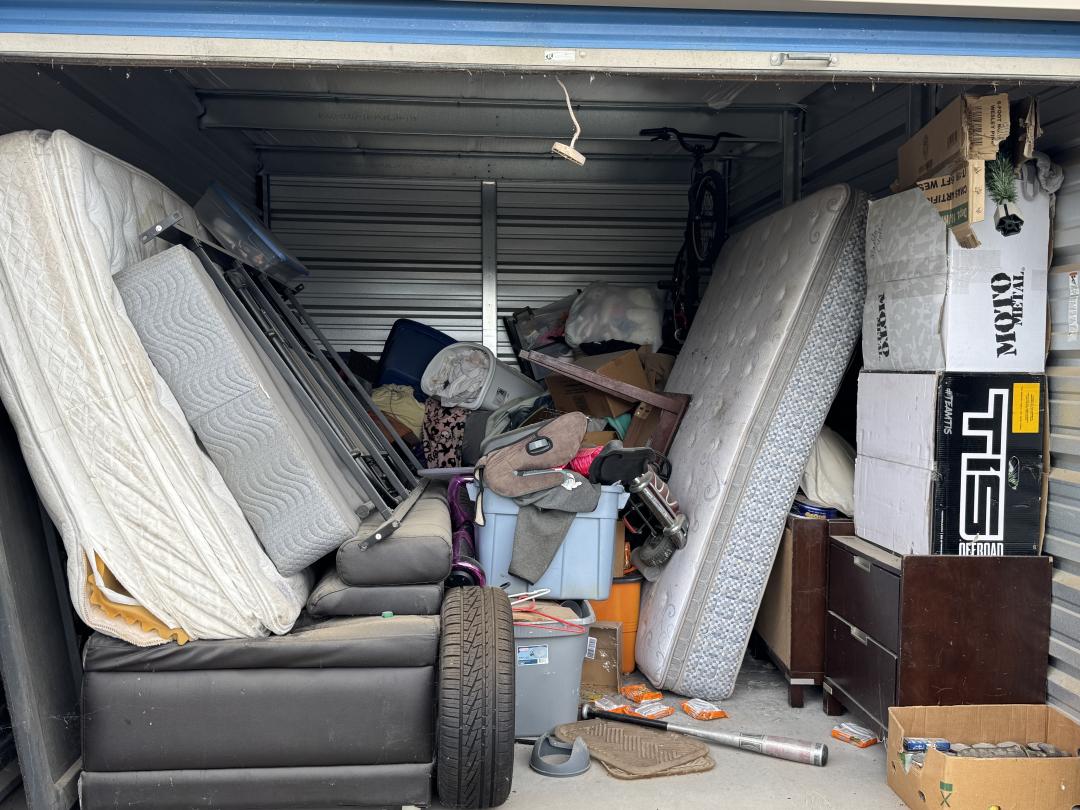 This unit appears to contain…Furniture, mattress, bins, boxes, miscellaneous.
