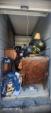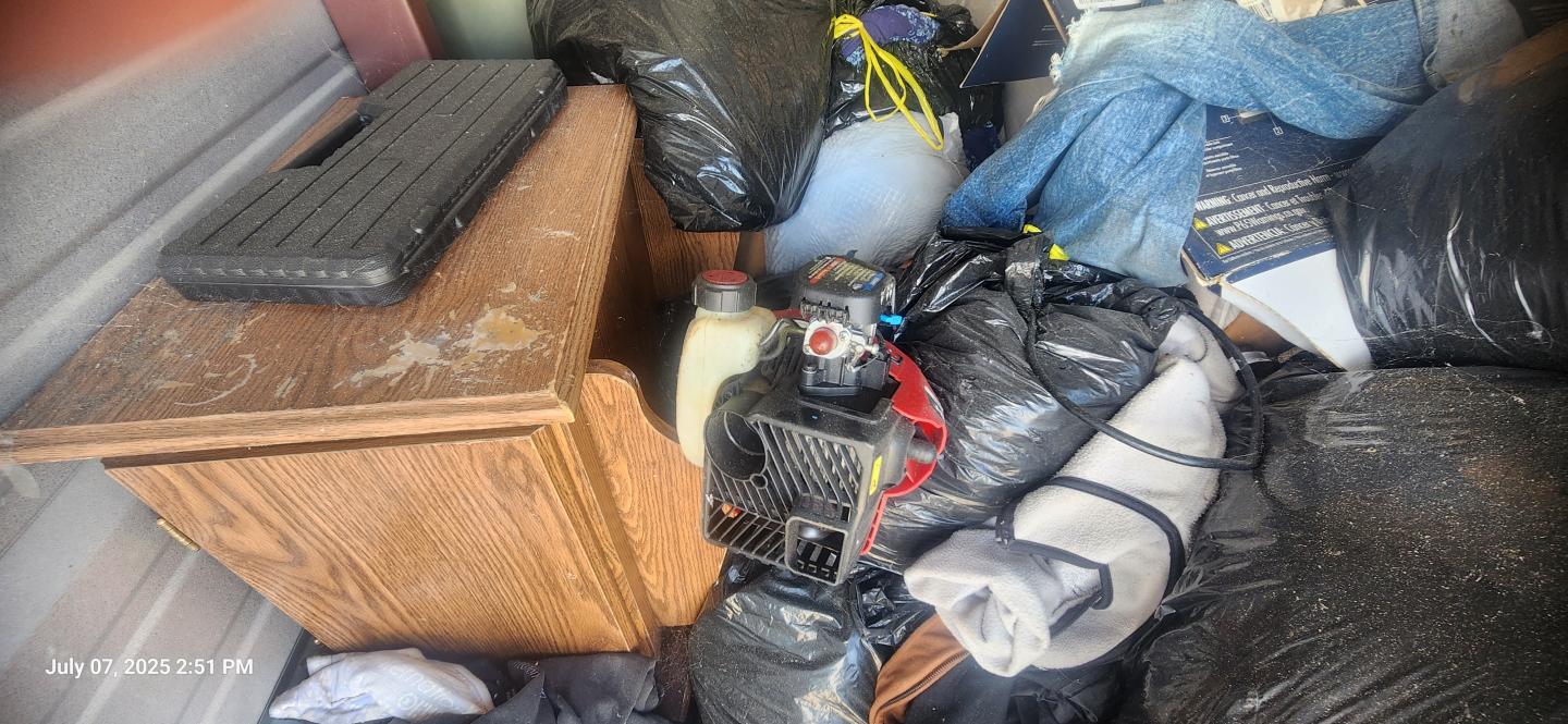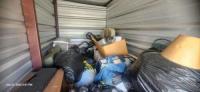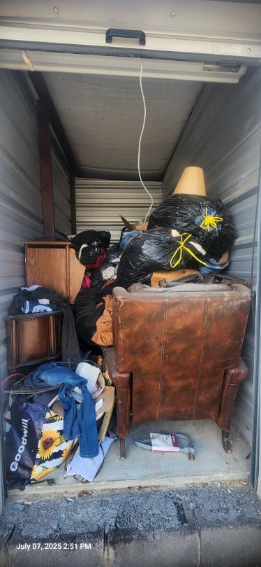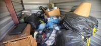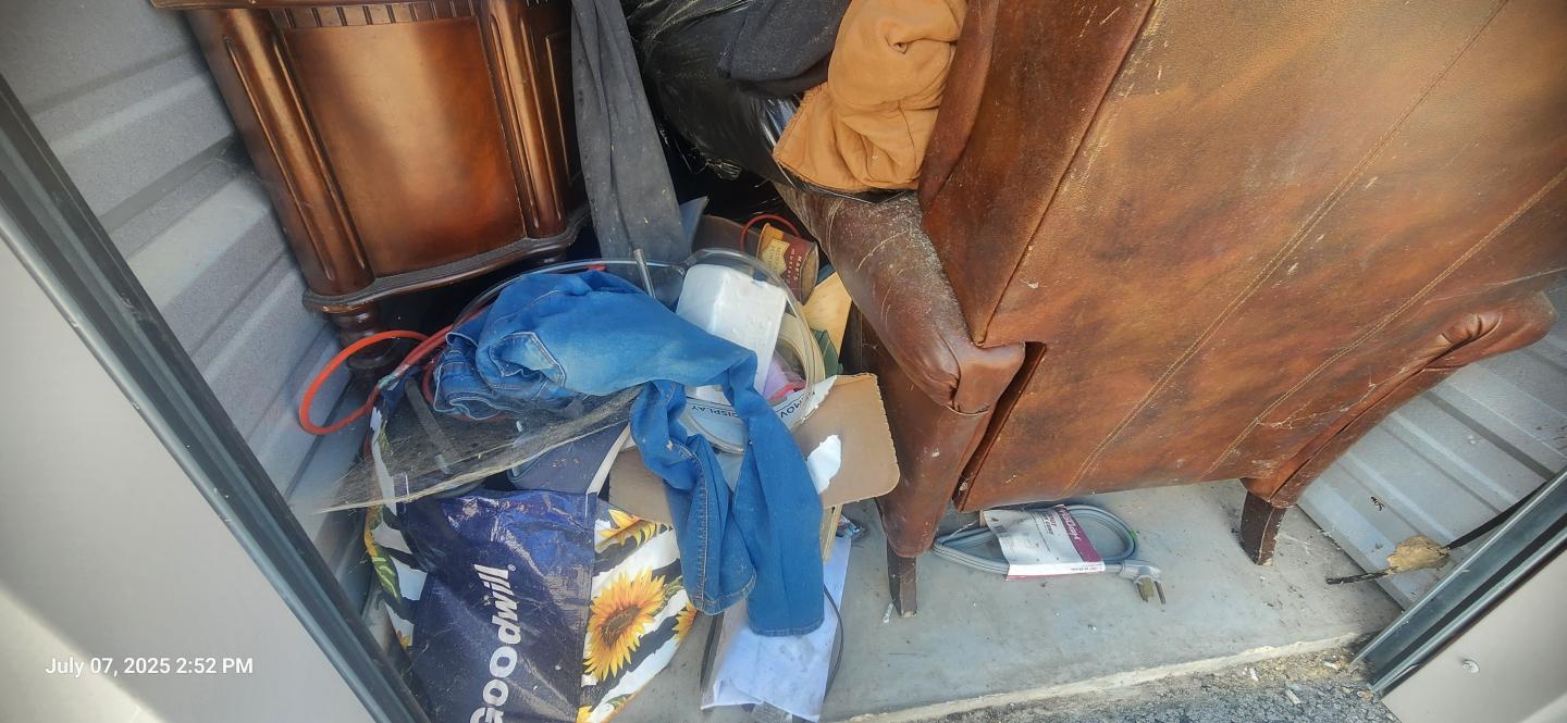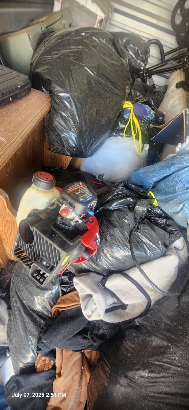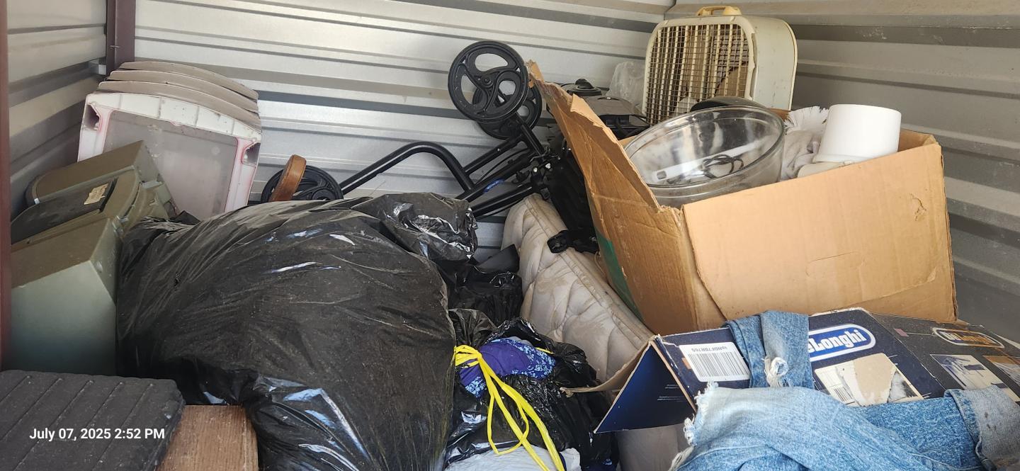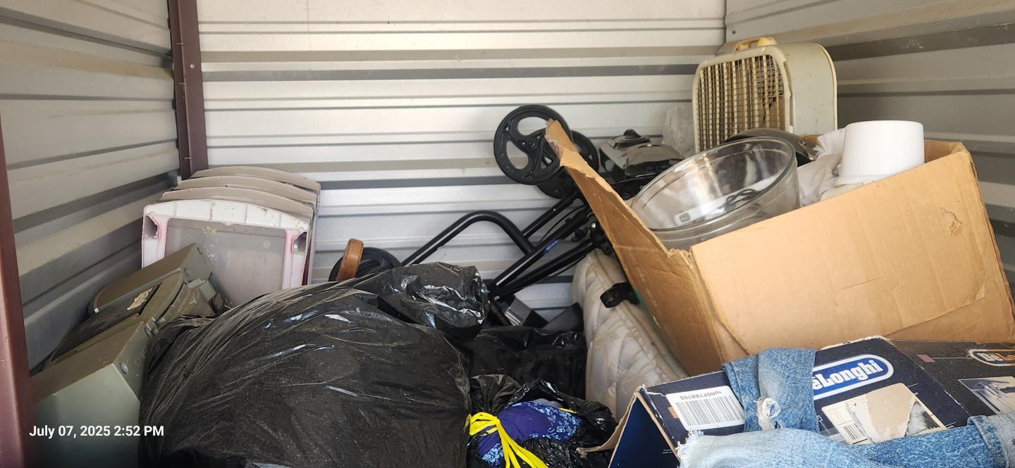 This unit appears to contain…This unit appears to have a lot of misc. items in it. Including weed eater, clothes, chair, box fan, wheel chair, kitchen items, mattress, lamp shade, a lot of bags and boxes with things in them.