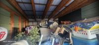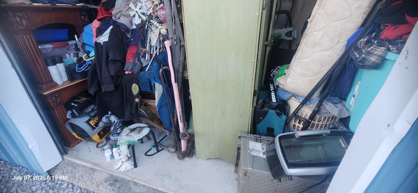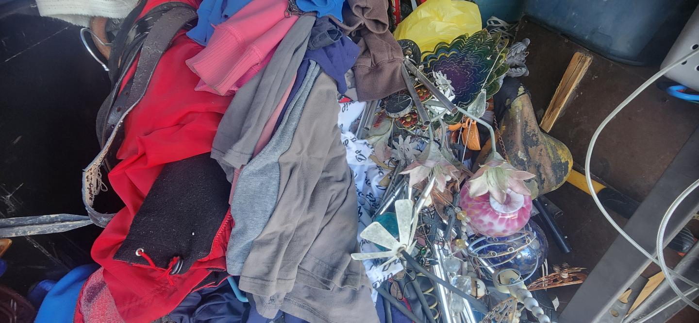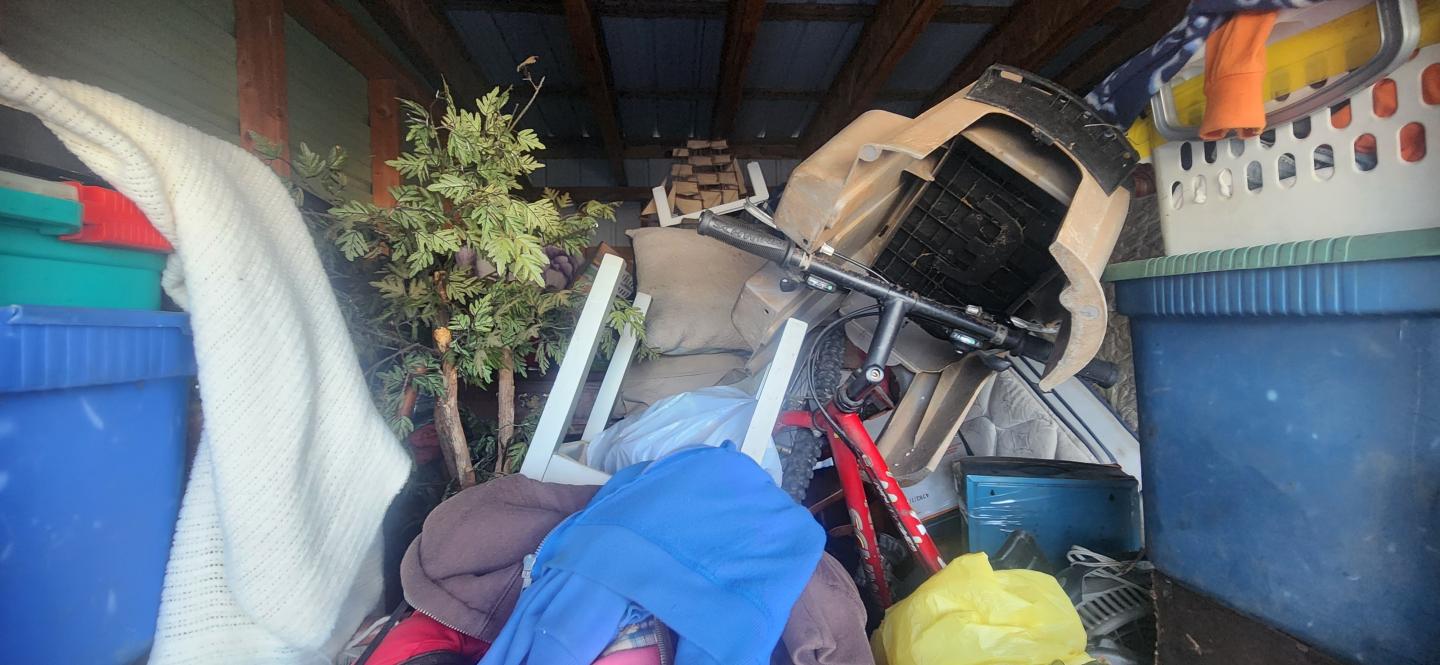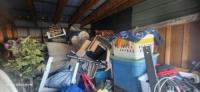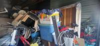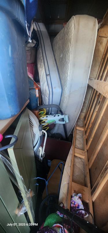 This unit appears to contain…This unit appears to have a lot of misc. items in it. There is no telling what you will find in this unit because it is piled up! It looks like there is a bike, tools, old ship, totes with things in them, box spring and mattress, garden items, DeWalt heater or fan, blankets or covers, fake tree, and more!