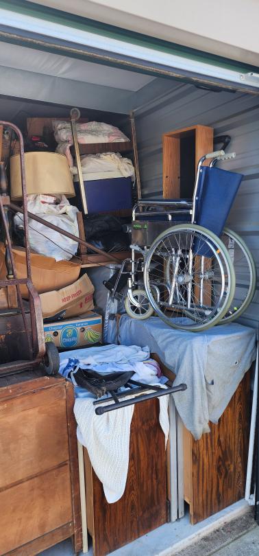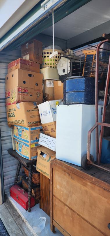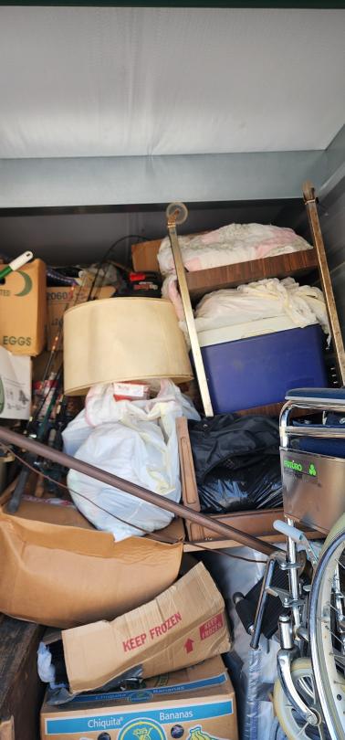This unit appears to contain…Unit appears to contain furniture, wheelchair, fishing poles, boxes, tool box, totes, lamps, crock pot, etc.