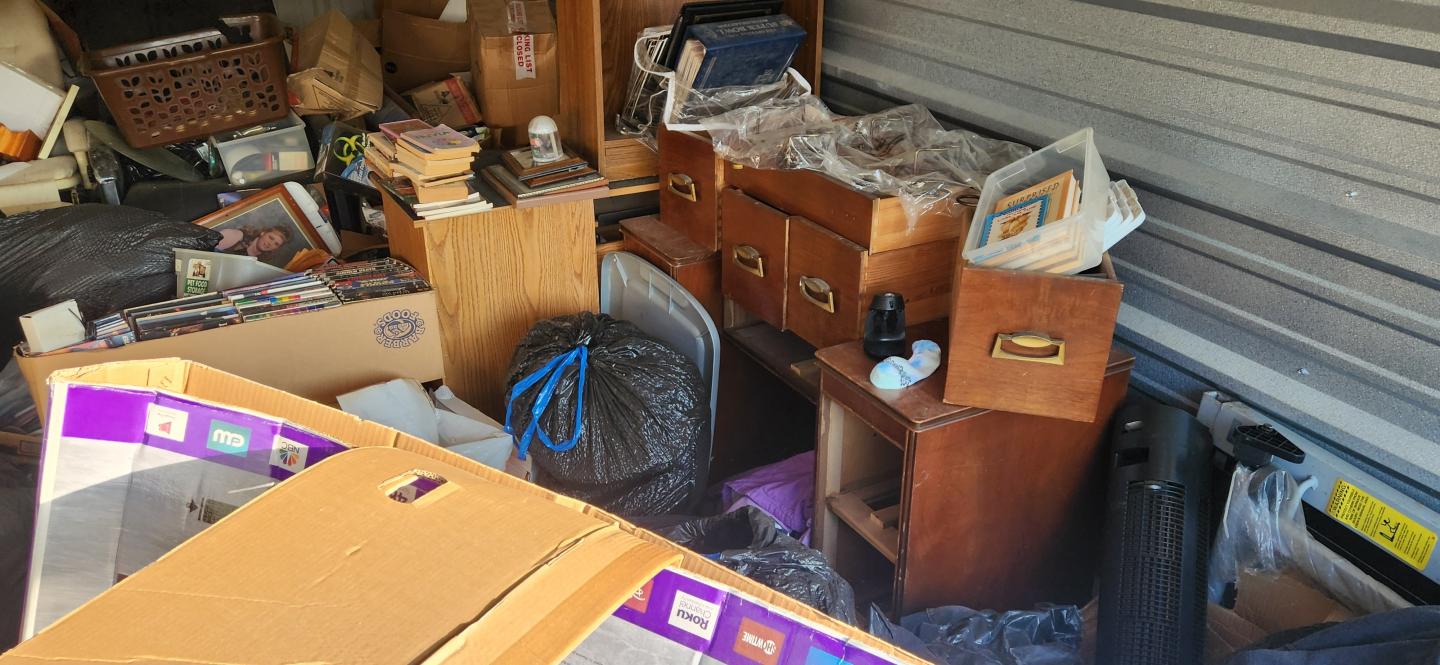 This unit appears to contain…This unit appears to have drawers filled with misc. items, DVDs/movies, furniture, chair, boxes with items, books, clothes, pillow, computer chairs and so much more!