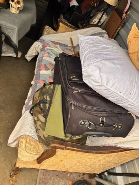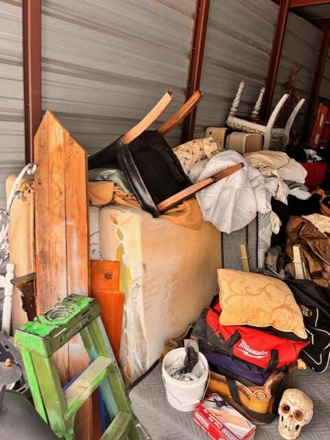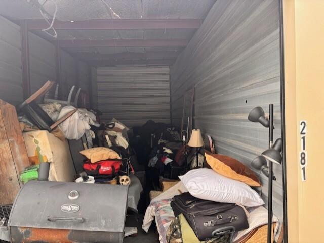 This unit appears to contain…Ladders, BBQ pit, dog kennel, ice chest, filing cabinet, couch, beds, household items, lamps, chairs, suitcases, FULL unit