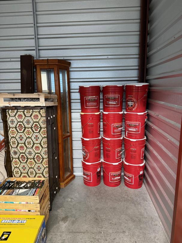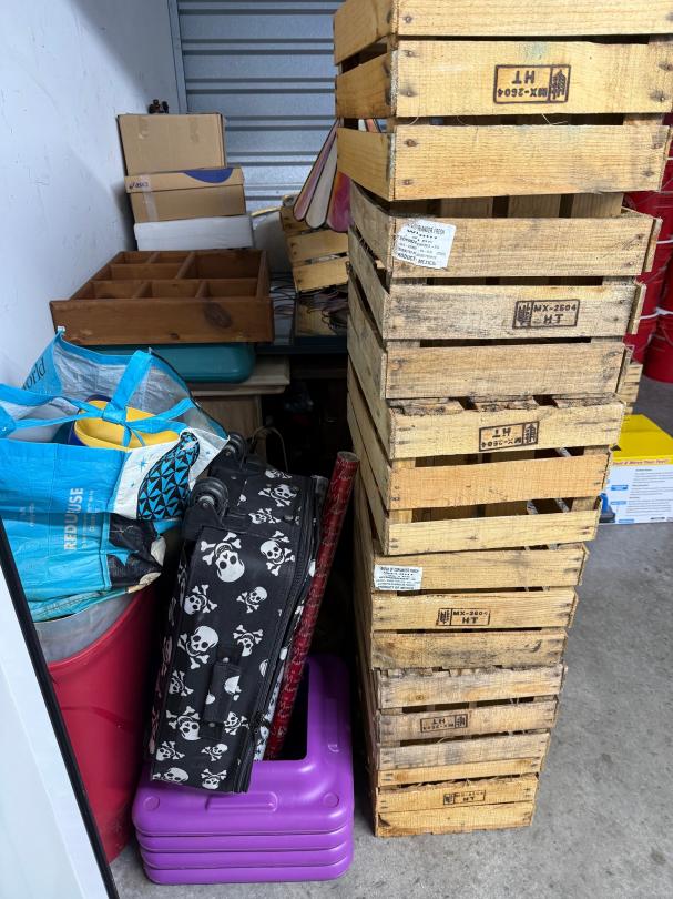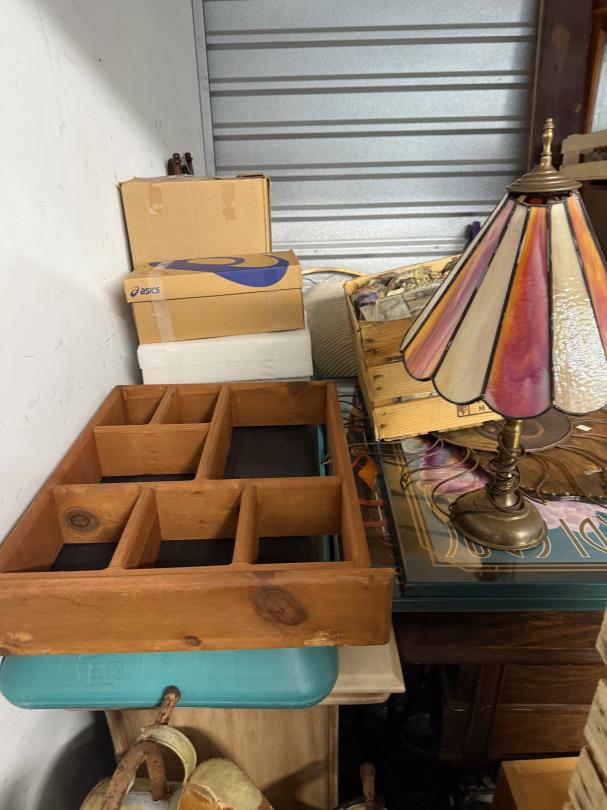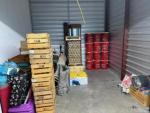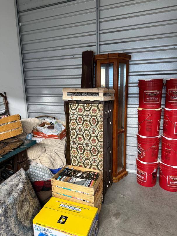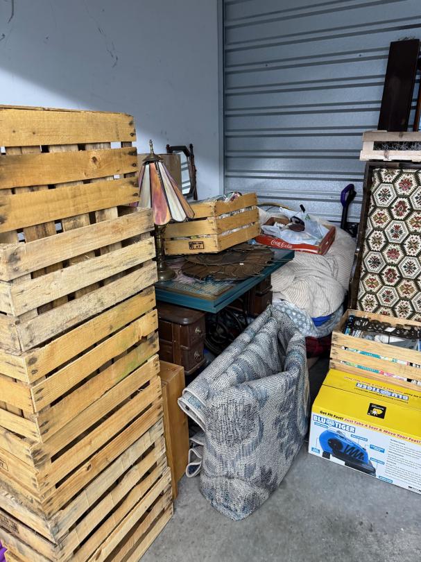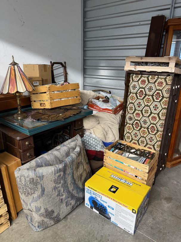 This unit appears to contain…(12) 5 gal buckets, antique desk, china cabinet, foot ottoman, exercise equipment, luggage, wood crates, wrapping paper, pictures, wall decor, rug, dog bed, lamp, vacuum, water jug, boxes