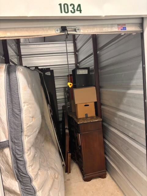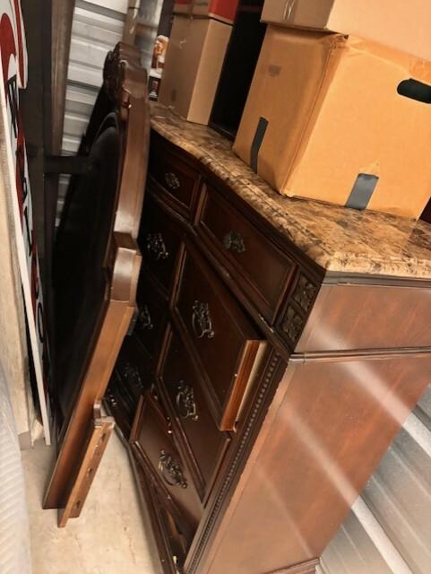 This unit appears to contain…2 twin box springs, dresser with mirror, various boxes of household items, home decor, small shelf
