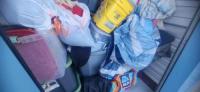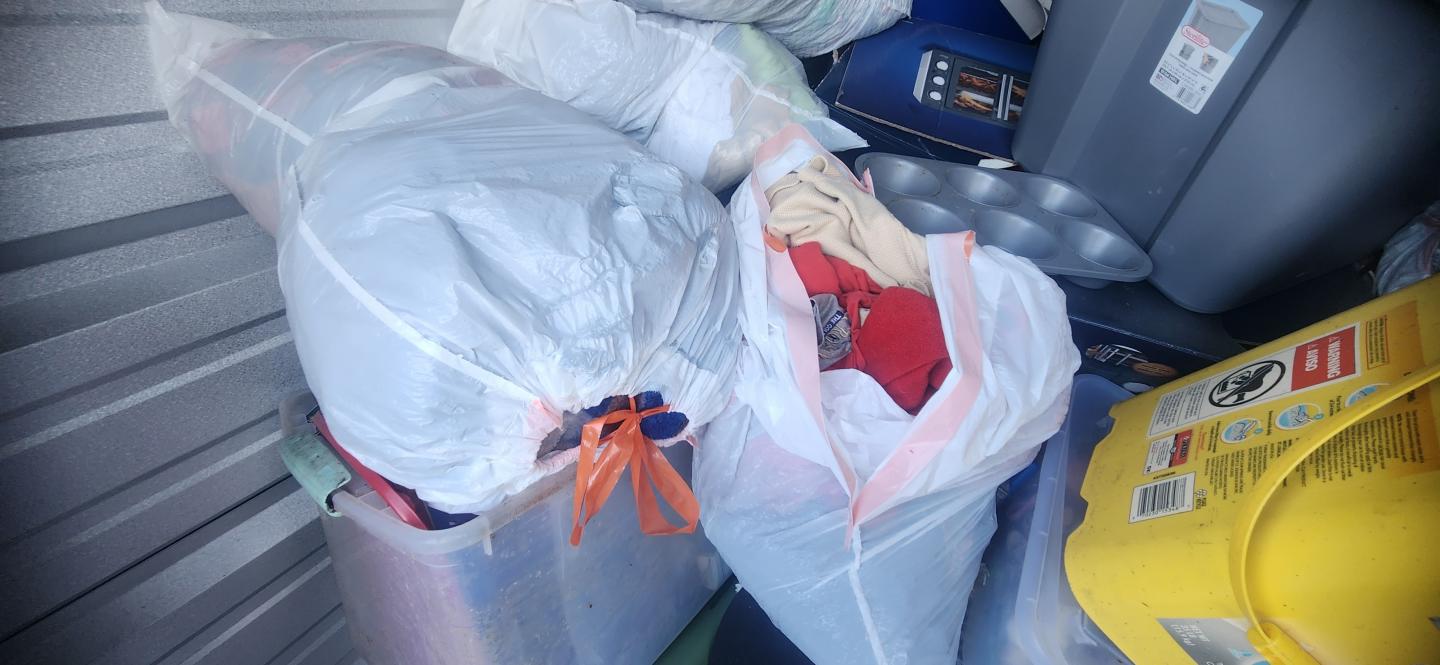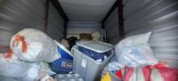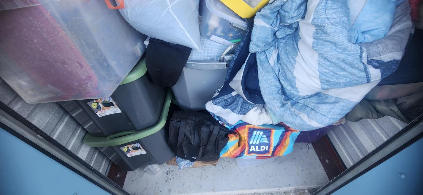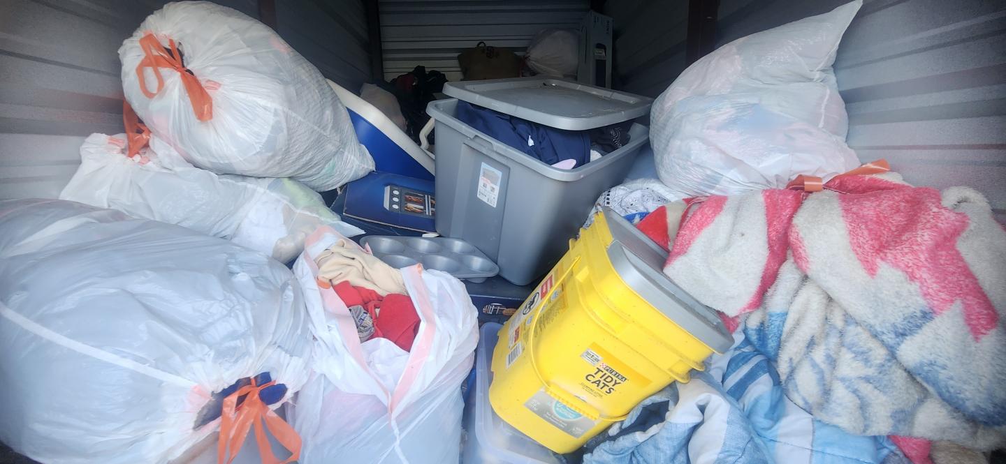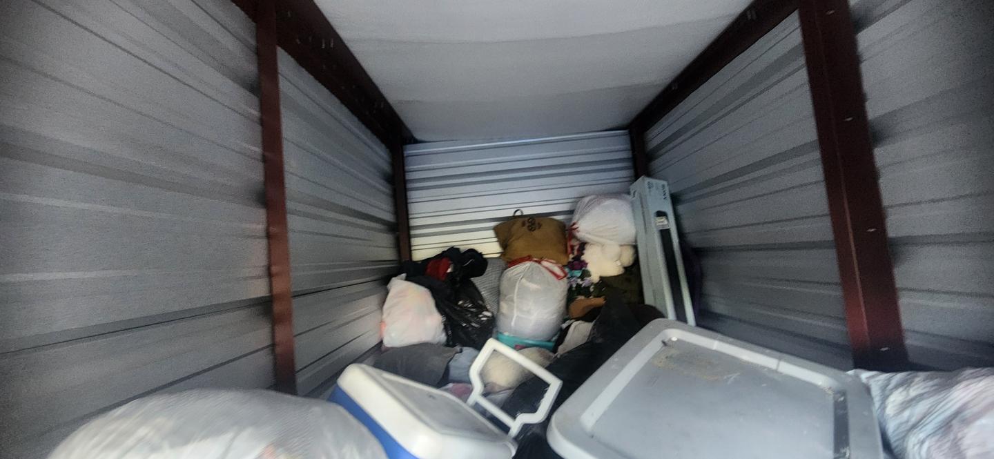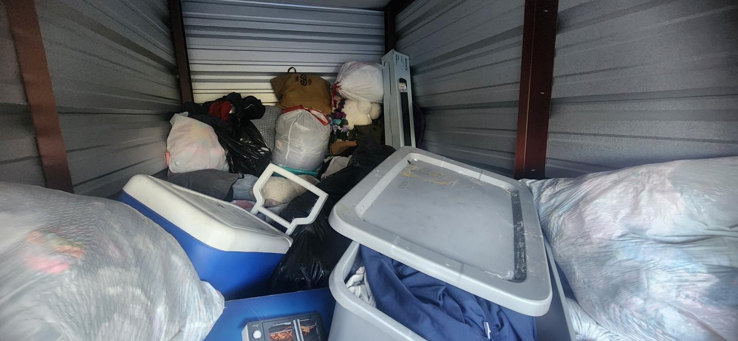 This unit appears to contain…This unit appears to have a lot of misc. items in it. Including totes, trash bags, covers, blankets, kitchen ware, cooler, clothes, and so much more!